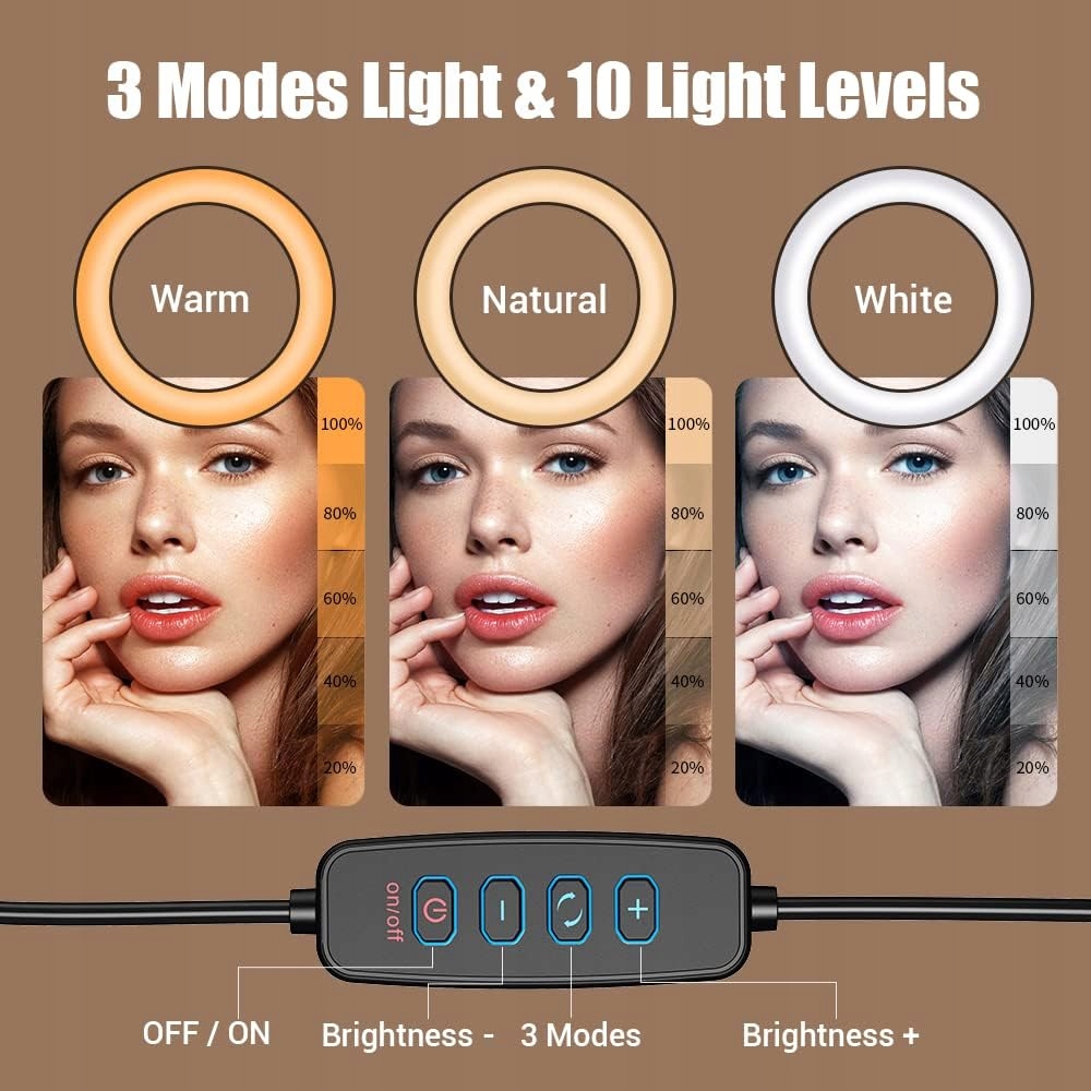 - Багато режимів світла: 3 режими світла та регульована кольорова температура та 10 варіантів чіткості. Наша світлодіодна кільцева лампа має 3 кольорові температури: тепла, природна та біла. Кожен світлий режим 10 рівнів яскравості, а кольорова температура може бути відрегульована в діапазоні від 3000 к до 6500 к