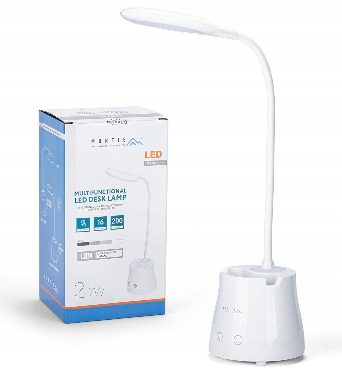 Офісна лампа Montis є багатофункціональним виробом, має тримач для телефону, ручку, нічник і основну лампу. Світильник оснащений основним світлом 16xLED SMD з триступеневим димуванням. Модель оснащена літієвим акумулятором ємністю 1200mAh. Заряджається за допомогою USB-кабелю, що входить у комплект, і вбудованого роз’єму microUSB. Ви можете безпечно використовувати світло під час зарядки. Виріб має сучасний вигляд і силіконову ручку, яка дозволяє гнучко регулювати кут освітлення.
