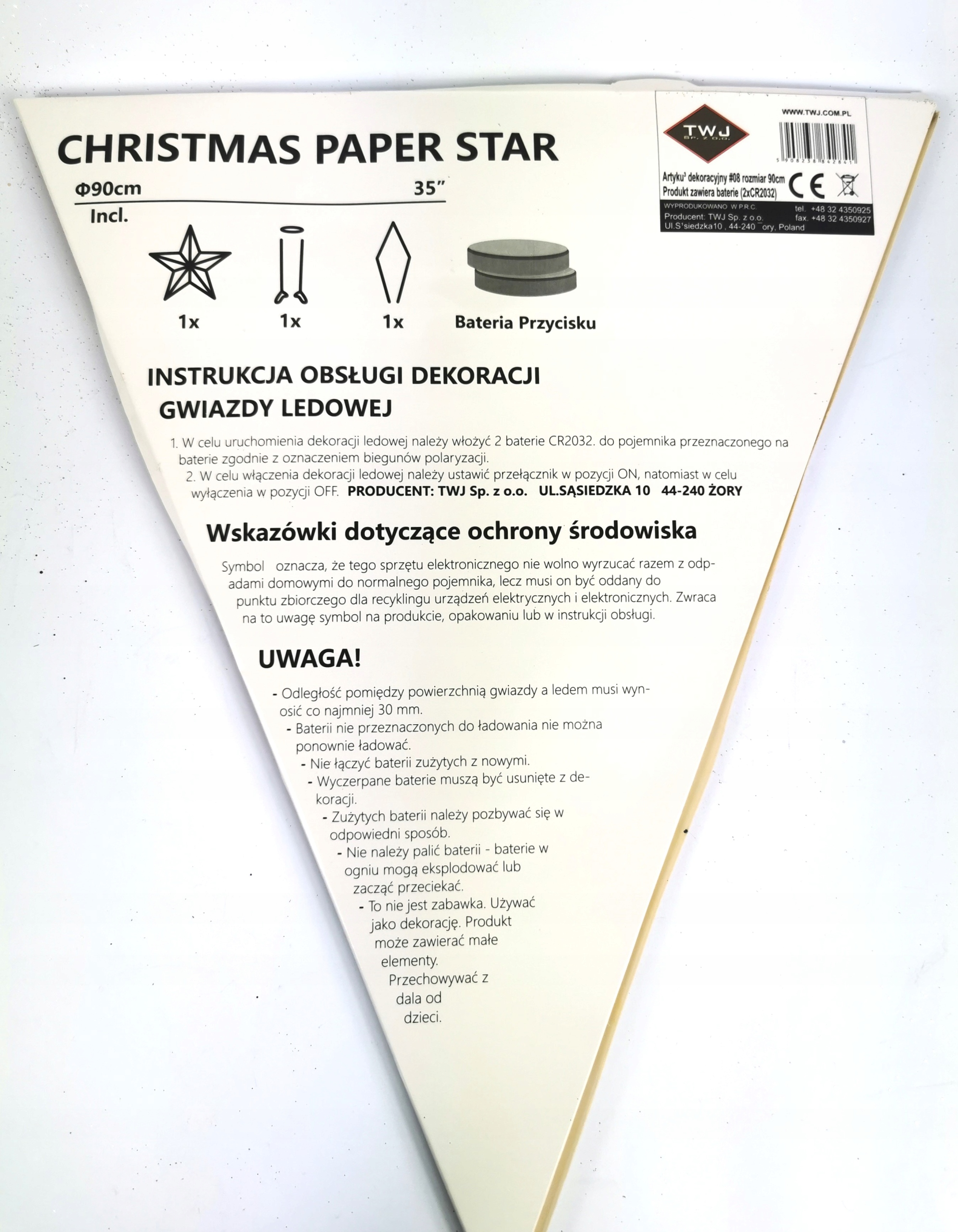 Просматривая «LED ПАПЕРОВА ЗІРКА, БІЛА РІЗДВЯНА ЯЛИНКА XXL 90CM», вы можете быть уверены, что данный товар из каталога «Витражи» будет доставлен из Польши и проверен на целостность. В цене товара, указанной на сайте, учтена доставка из Польши. Внимание!!! Товары для Евросоюза, согласно законодательству стран Евросоюза, могут отличаться упаковкой или наполнением.