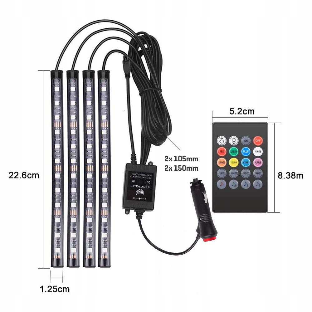 Світлодіодні стрічки легко змінять салон вашого автомобіля. Чотири водонепроникні світлодіодні модулі можна встановити під сидіннями, в кабіні, в багажнику і не хвилюватися про вологу. Живиться від розетки прикурювача, встановлення надзвичайно просте. Просто підключіть його, і він готовий!