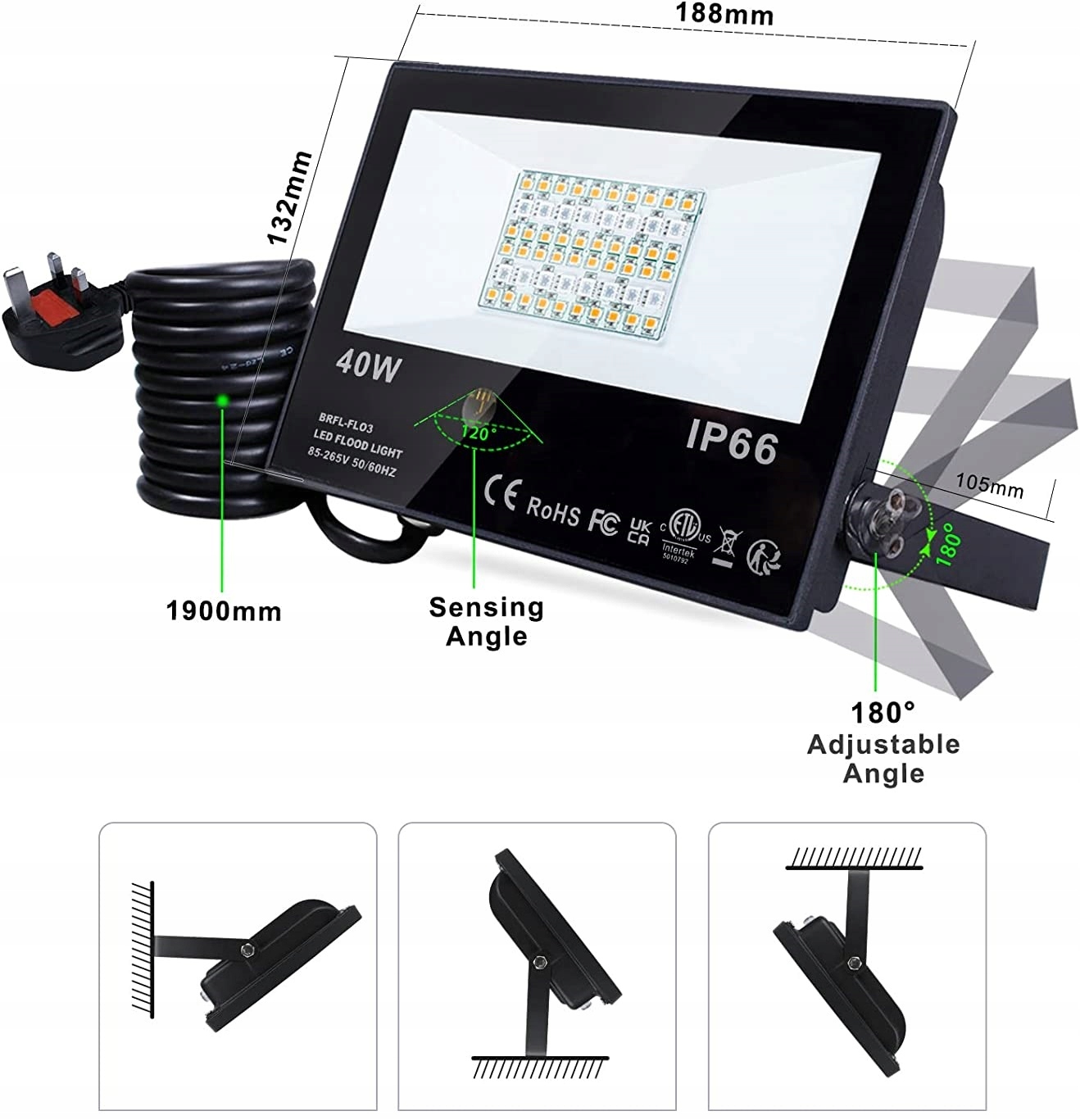 - Відбивач RGBW: 40 Вт, 4000 люмен, теплий білий, індекс передачі кольору CRI>85 і 120 кольорів RGBW. Радіус дії інфрачервоного датчика до 6 метрів, кут освітлення та кут виявлення інфрачервоного випромінювання з пульта 120°. Садове освітлення, водонепроникність IP66 і термін служби до 50 000 годин.