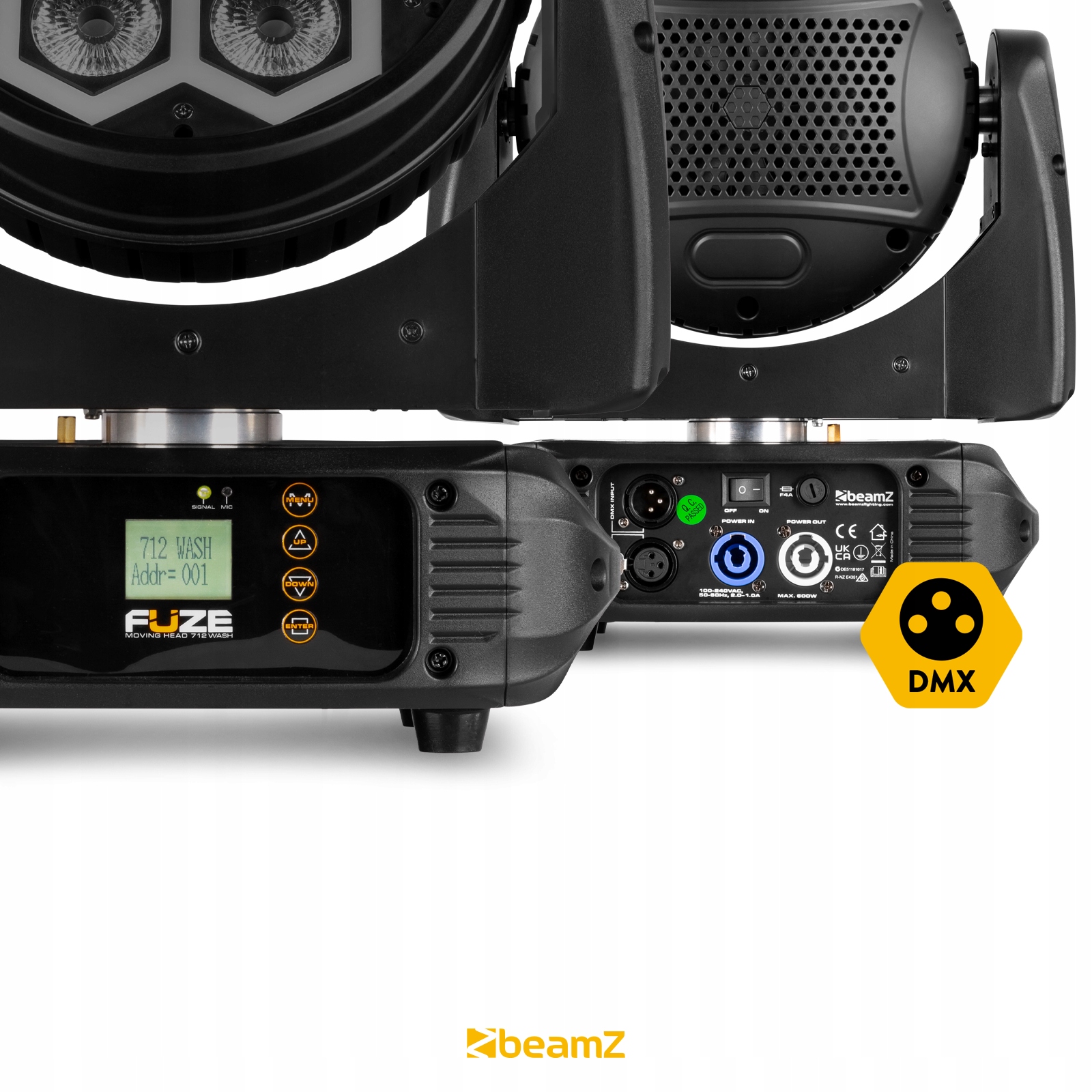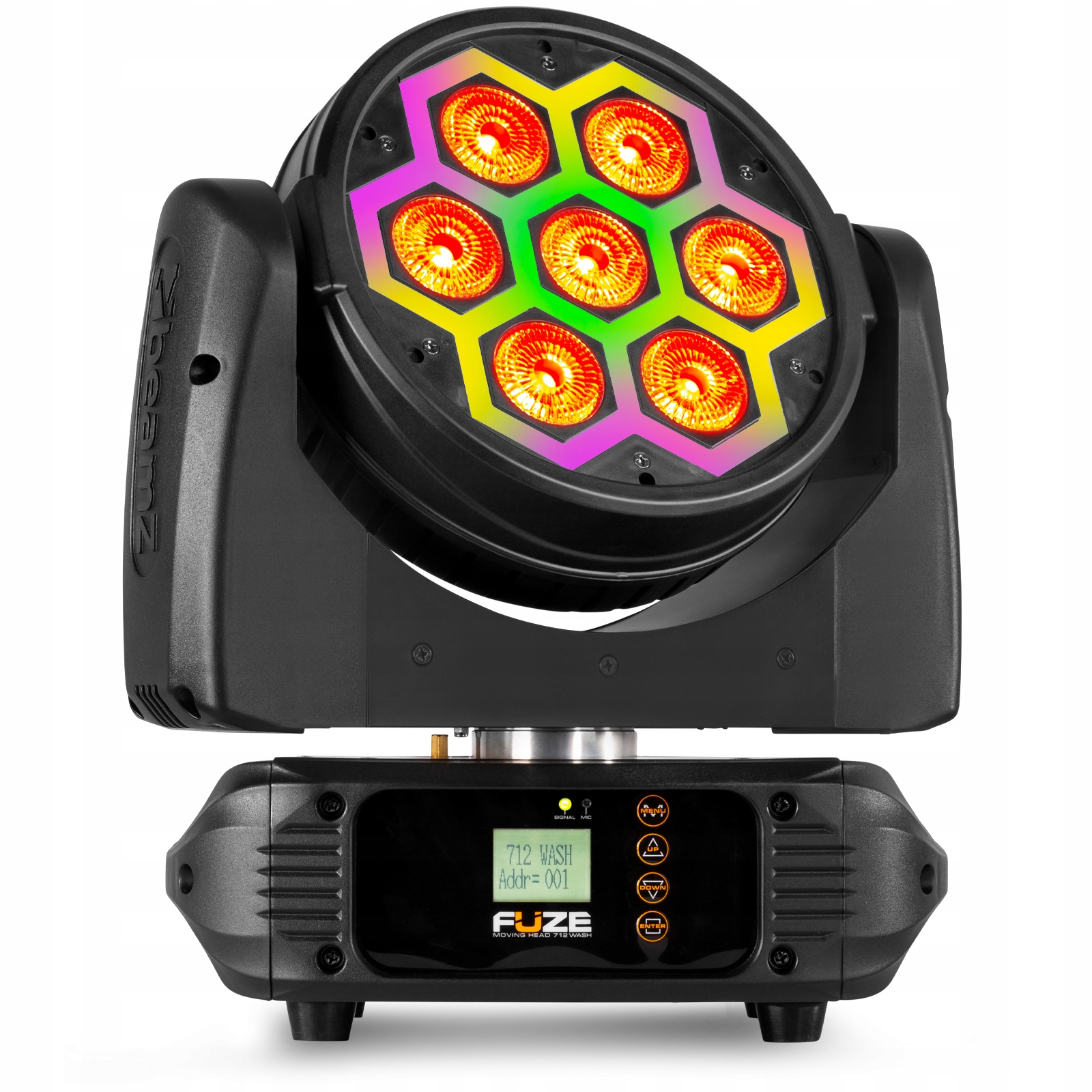 Крім 7 світлодіодних ламп, FUZE712 також оснащений своєрідним неоновим ефектом. 60 світлодіодів SMD розташовані навколо світлодіодів RGBW у формі шестикутника. За допомогою цього додаткового ефекту ви можете створювати чудові візуальні ефекти, що робить FUZE712 унікальним у своєму роді. Іншим ефектом є стробоскоп від FUZE712, який може блимати до 21 разів на секунду. Сама голова має великий діапазон обертання 540° і нахилу 180°, що забезпечує великий просторовий діапазон.