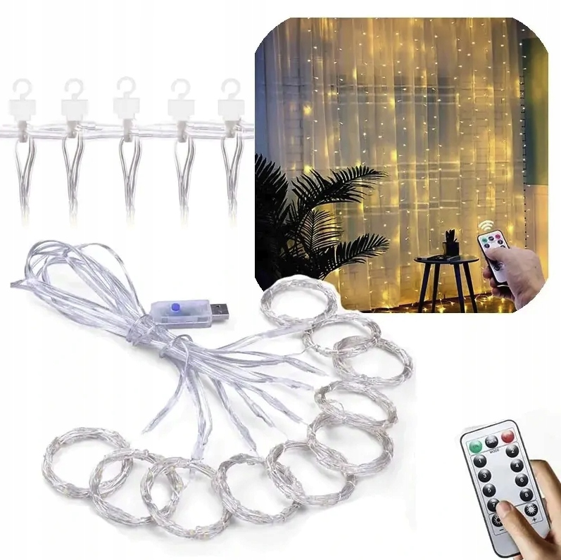 LED СВІТЛОВІ ШТОРИ, USB ПРОВІД, ДИСТАНЦІЙНЕ СВІТЛО, ТЕПЛИЙ БІЛИЙ 2х2м ГАЧКИ