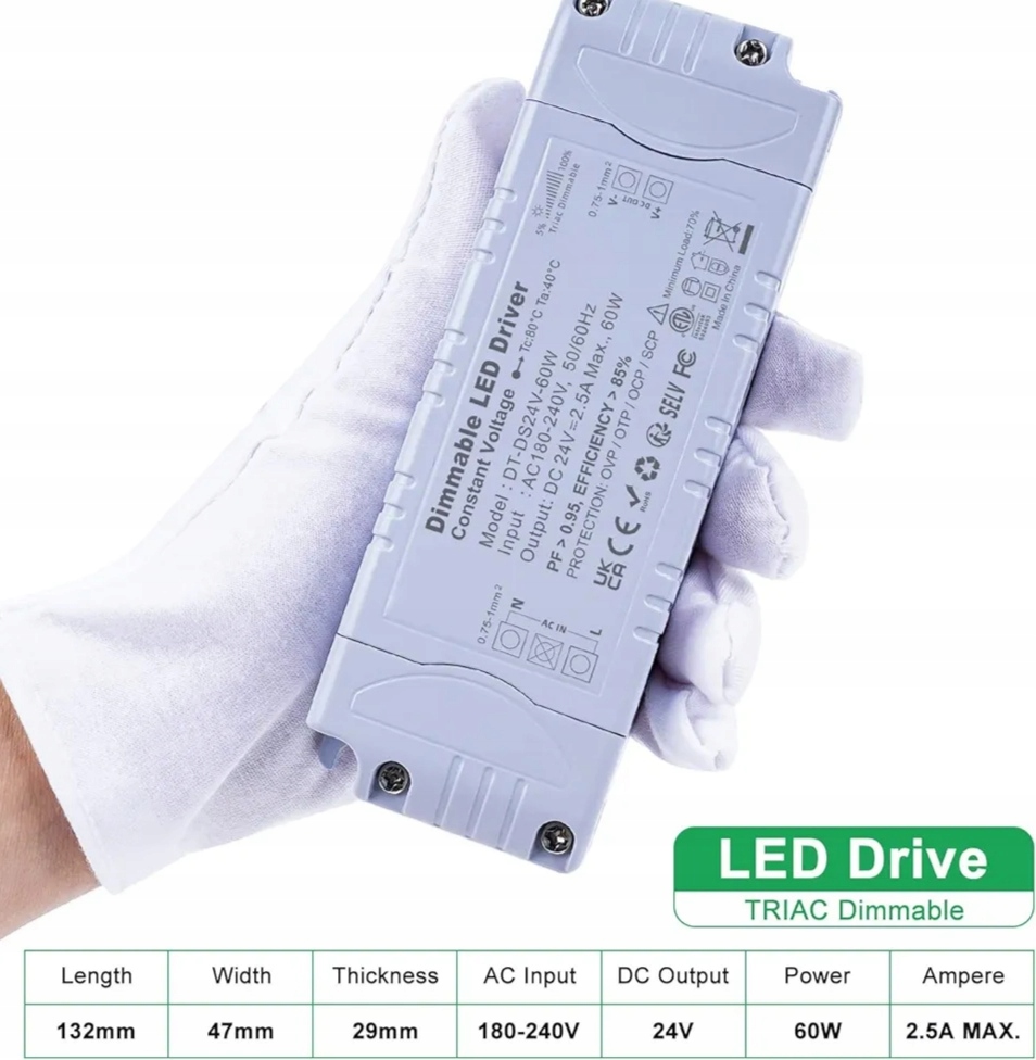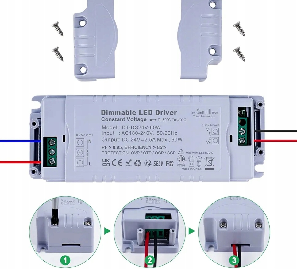 - Світлодіодний драйвер із регулятором постійної напруги класу II, вхід змінного струму 180–240 В, вихід постійного струму 24 В, 50/60 Гц.