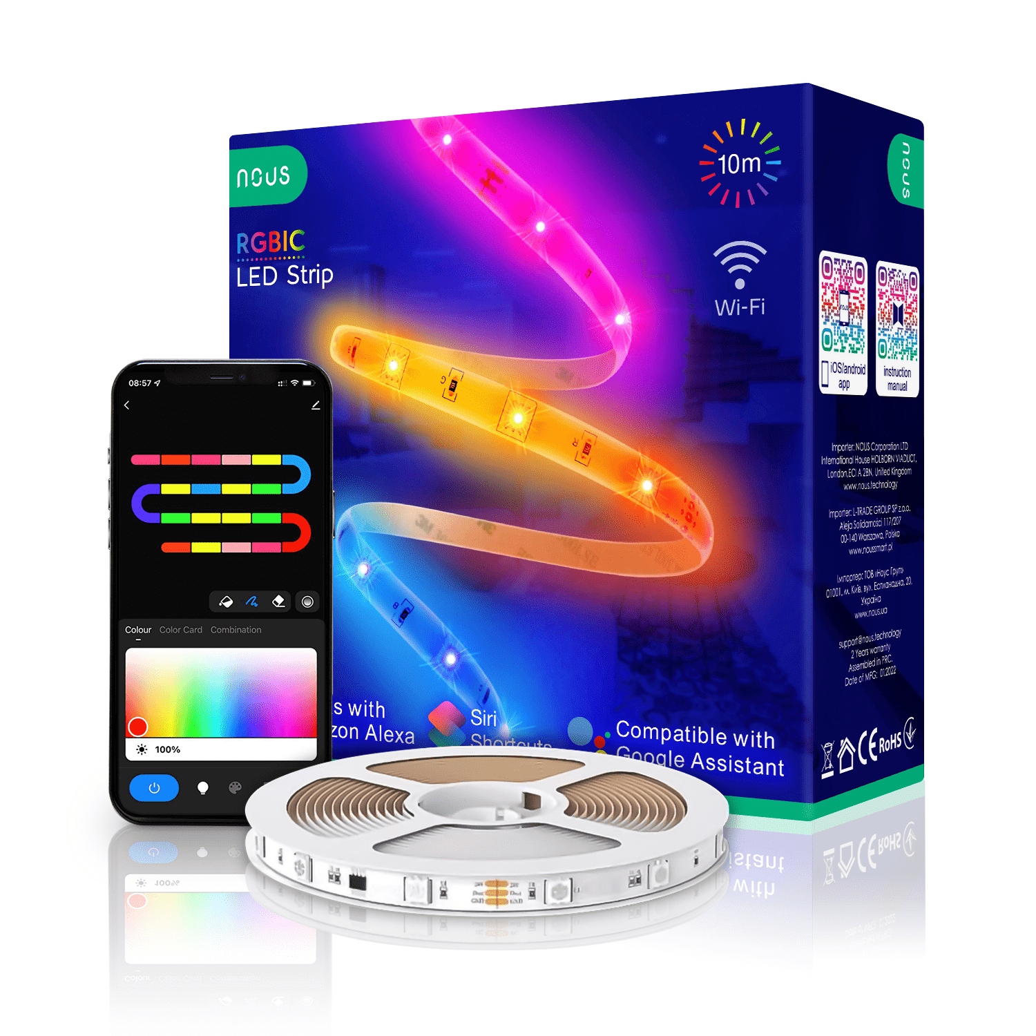 Інтелектуальна світлодіодна стрічка RGB+IC WIFI NOUS F5 з пластику потужністю 24W і світловим потоком 1700lm. Додаток NOUS Smart Home на вашому смартфоні дозволяє дистанційно керувати підключеним до нього пристроєм. Програму можна завантажити на платформі Android у магазині Google Play та на Apple iOS в App Store.