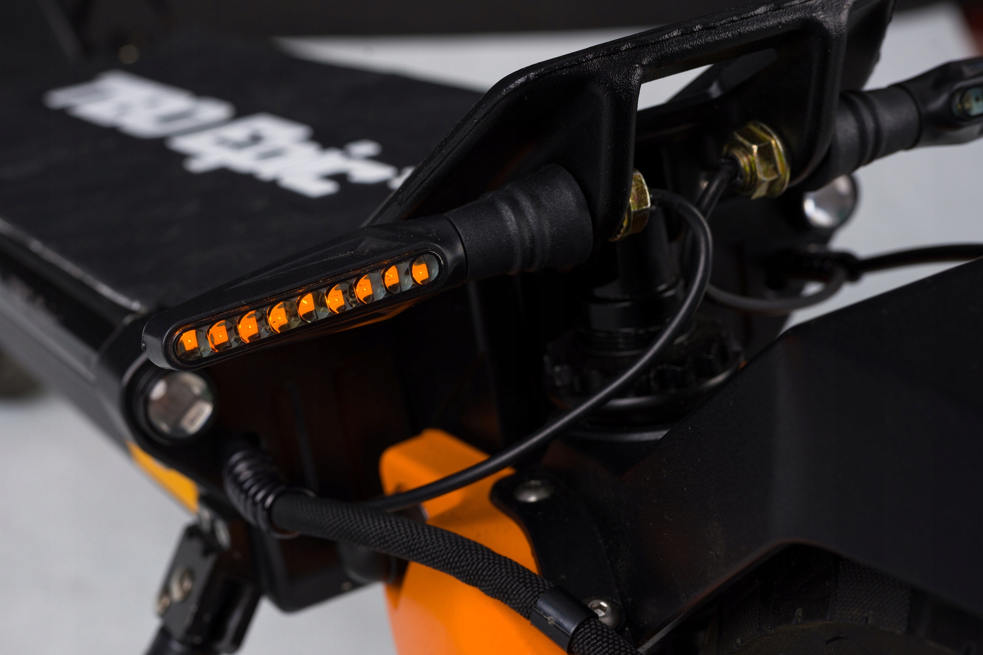 Ультрасучасне освітлення електросамоката TIBO EPIC+ — це непорушна перевага! Завдяки використанню RGB-підсвічування та підключенню до смартфону ви можете налаштувати кольори підсвічування відповідно до ваших потреб, а скутер додатково оснащений покажчиками повороту та звичайними вогнями.