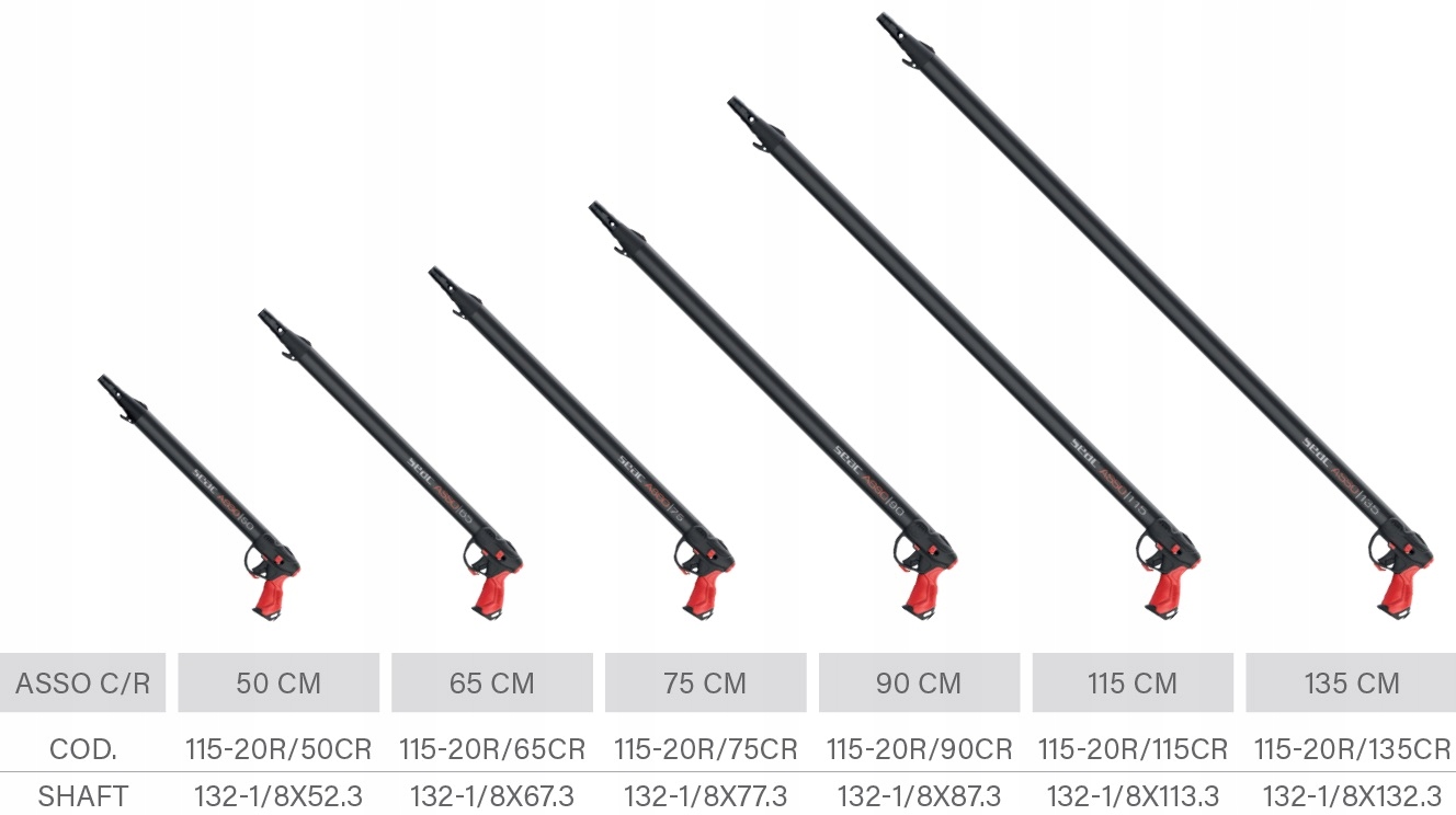 Арбалет Seac Asso C/R (з регулюванням) доступний у 6 довжинах, від Asso C/R 50 до Asso C/R 135.