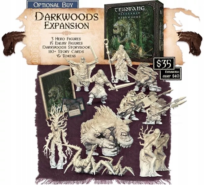 Trudvang Legends: Darkwoods – це доповнення, яке містить абсолютно нову кампанію, яка відкриває гравцям розгалужену історію у великому та моторошному лісі Darkwoods, величному, але зловісному лісі, де панує темрява. Ходять чутки, що в його глибинах сховався демон, який крутить і маніпулює істотами, тероризуючи всіх, хто наближається до нього. Вам належить дослідити джерело цих чуток і спробувати пережити саму експедицію! Крім того, представлено абсолютно новий ігровий клас, Мисливця на демонів, який опановує темні сили та змінює межі між добром і злом.