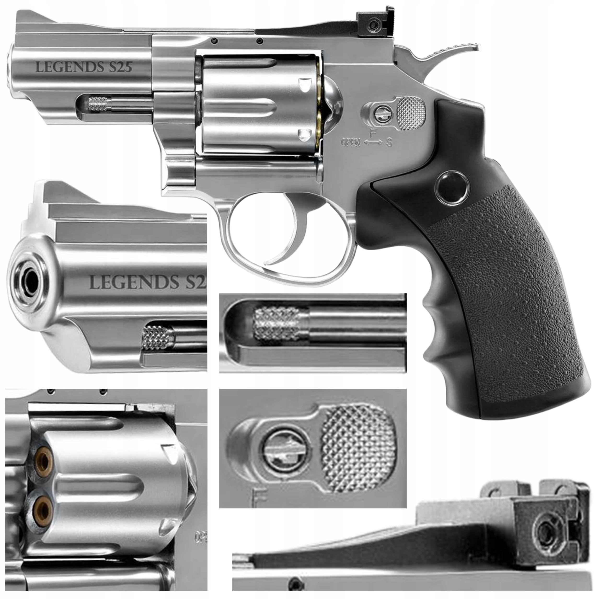 Високоякісний пневматичний револьвер, повністю метал, закінчений гладкою кришкою нікелю. Ми пропонуємо три можливі версії Windbreaker з різною довжиною бочки - S25 (2,5 дюйма), S40 (4 дюйми) та S60 (6 дюймів). Щоб надати зброю справжність, барабан містить шість камер для лусочок, до яких завантажується постріл діаболо, а бочка нанизується для підвищення точності пострілів. Регульований SZCZERBINKA. Одного Co₂ 12 G Cap достатньо, щоб вистрілити близько 60 пострілів. Револьвер має тригер SA/DA (єдина дія/подвійна дія), ви можете стріляти, натягуючи кран за допомогою тригера (Samonapinanie), а також після витягування крана пальцем. Захист від неконтрольованого пострілу - це вимикач для зливного блокування