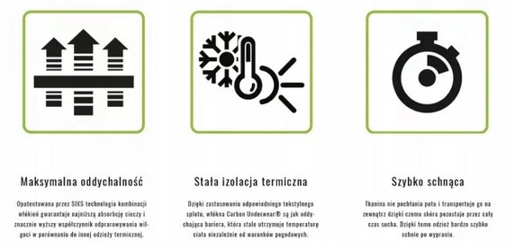 - "Гідрофобна хвиля" - волога переноситься назовні та швидко випаровується. Шкіра суха, а теплоізоляція завжди однакова.