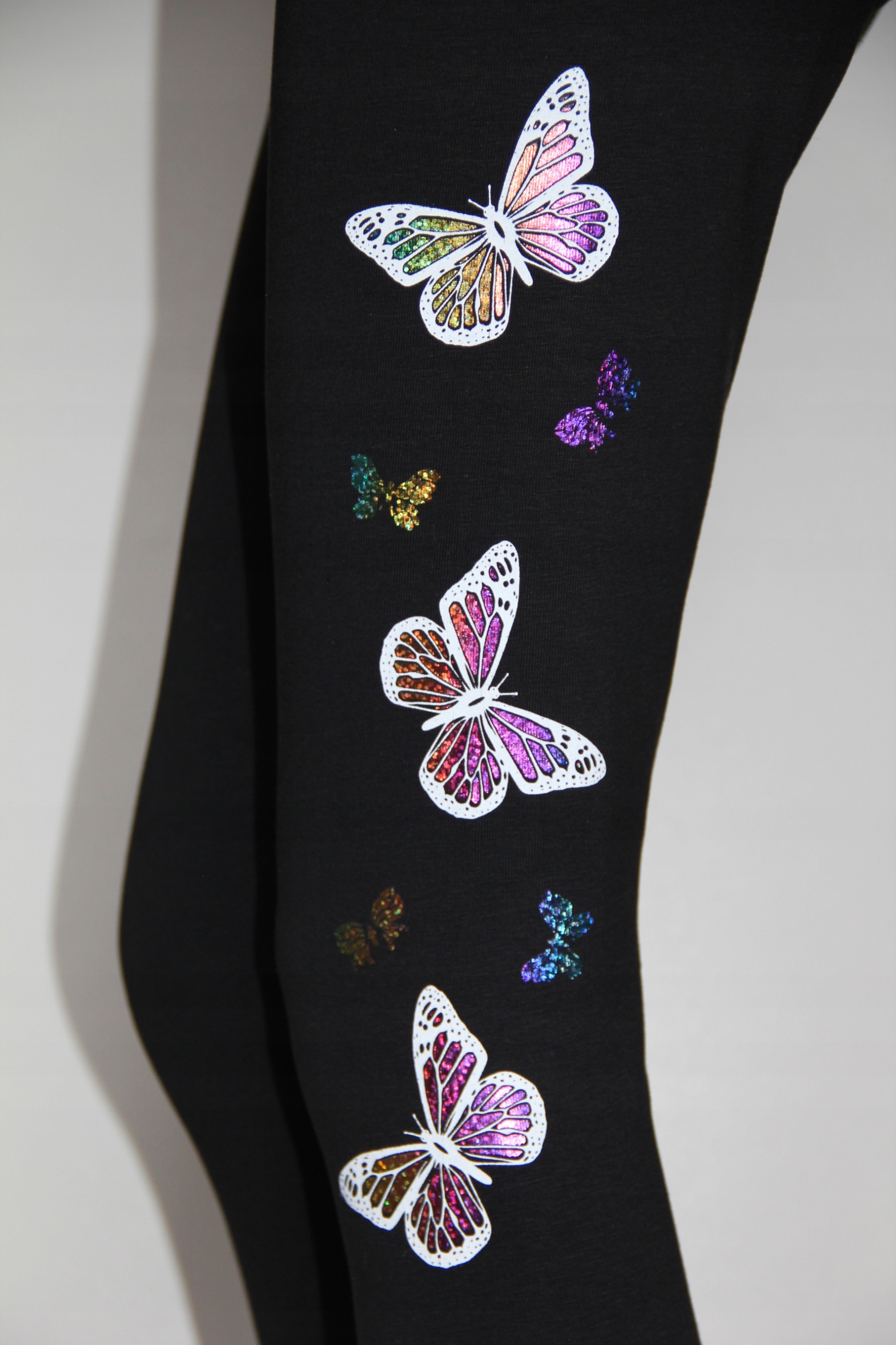 - різнобарвна блискуча аплікація метелик на лівій нозі< /li >
