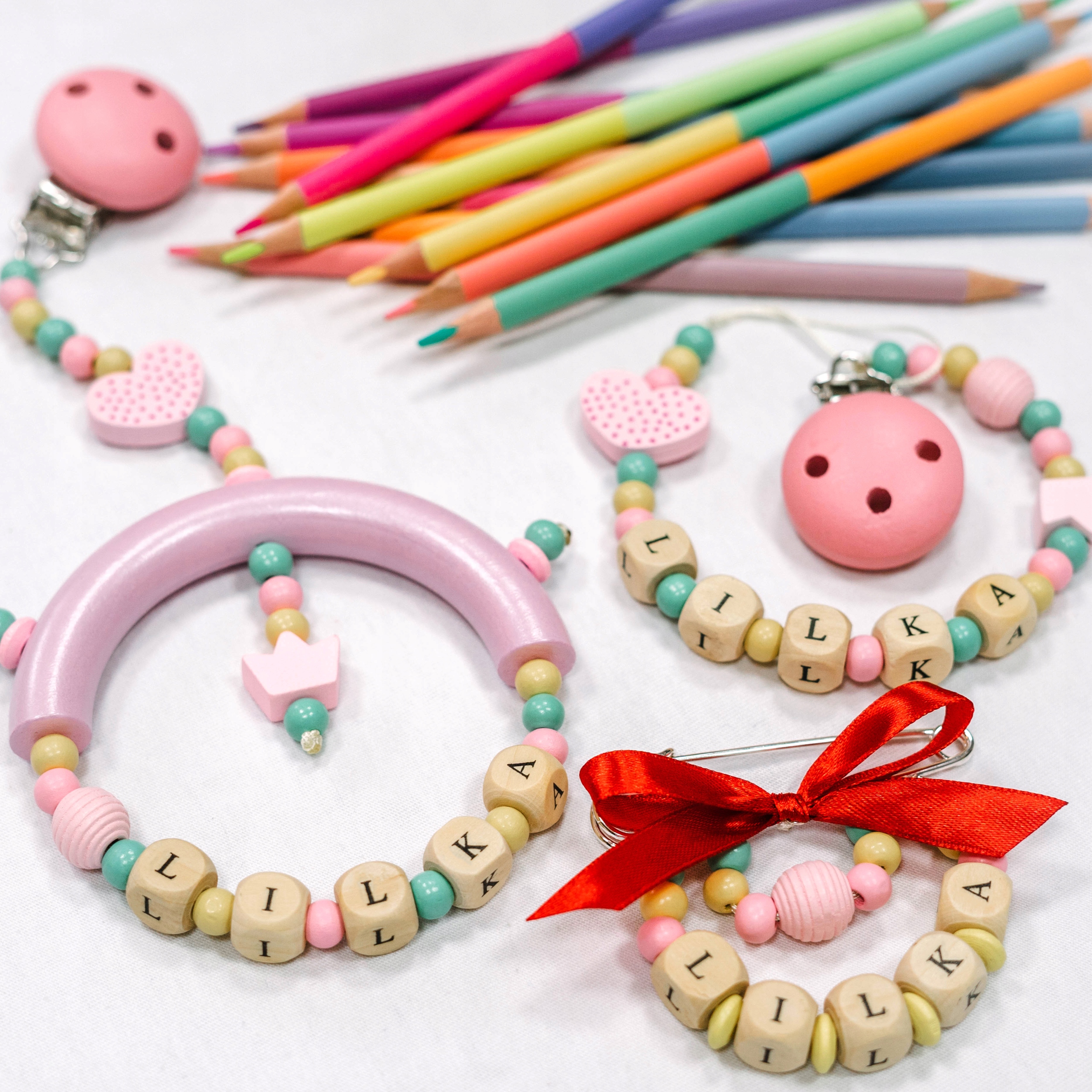 Дерев'яна персональна підвіска для пустушки або прорізувача з іменем вашої дитини.