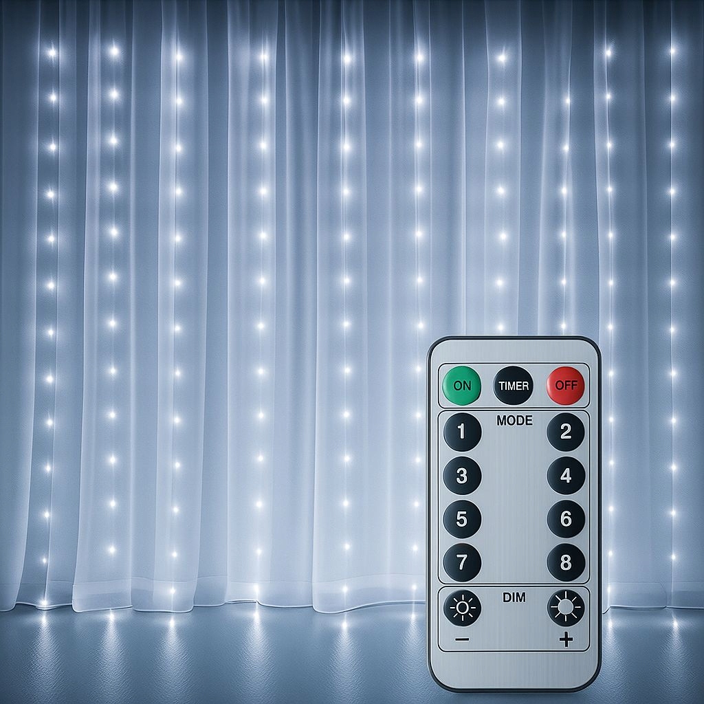 світлодіод 3 × 3 м (300 світлодіодів) у холодному білому кольорі Це ідеальне рішення! Завдяки ефекту падаючих легких смуг завіса прекрасно прикрасить вікно, стіну або магазин, надаючи інтер'єрній елегантності та магічному сяйві. Це не лише прикраса, але й спосіб побудувати затишну, святкову атмосферу, яка порадує домогосподарство та гостей ..