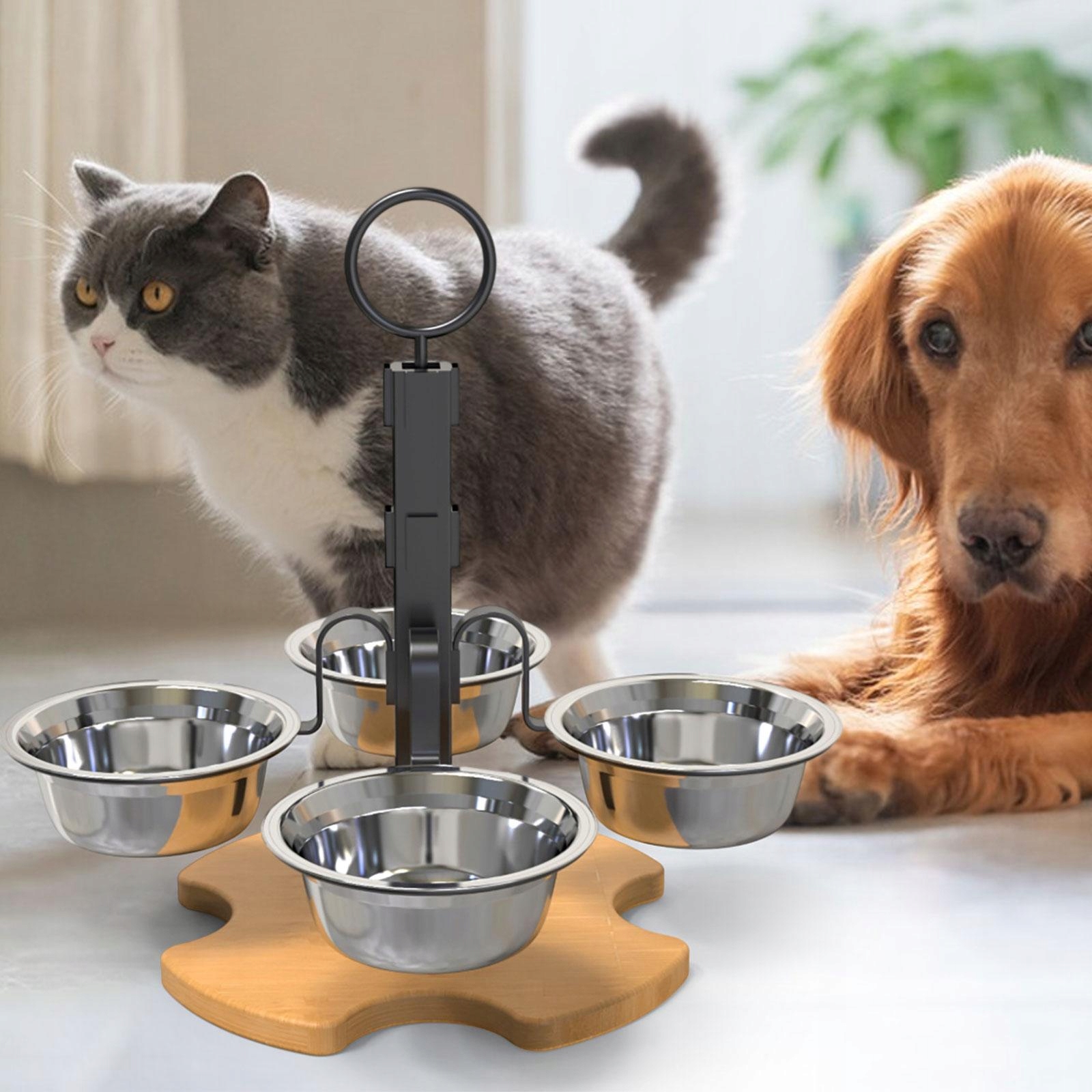 [4 миски з нержавіючої сталі]: наша підставка для миски для собак містить миски з нержавіючої сталі. Набір з 4 мисок ідеально підходить для забезпечення вашого вихованця сухим, вологим кормом і водою. Станція для годування домашніх тварин великої місткості задовольнить щоденні потреби вашого вихованця в раціоні та воді.