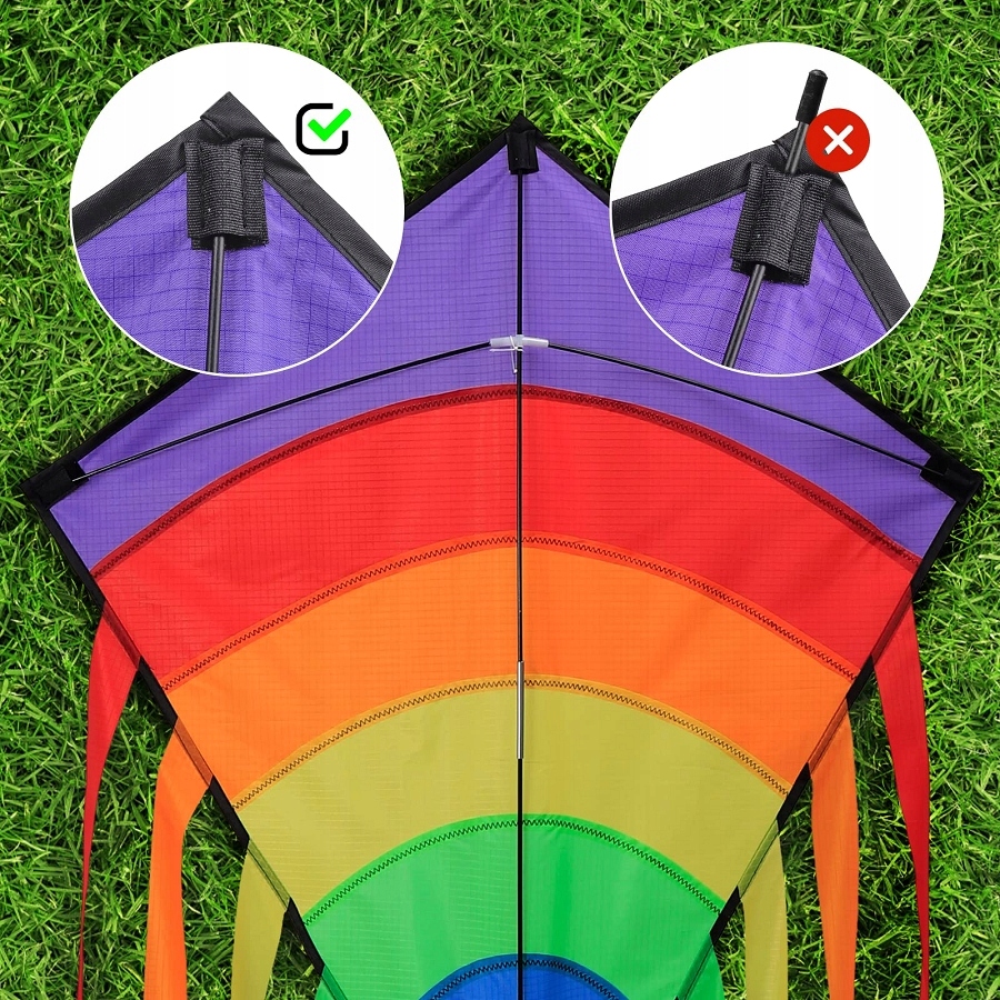 - 🌈 райдужний повітряний змій розміром 73 x 65 см із 8 відповідними різнокольоровими хвостами довжиною 105 см і довжиною канату повітряного змія 80 м. Набір повітряних зміїв, який легко зібрати, ідеально підходить для початківців.