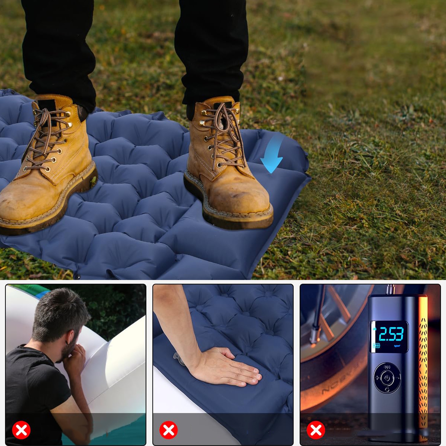 Завдяки покращений насос. Для швидкого надування наш кемпінговий килимок можна накачати за допомогою тиску ногою або рукою. Більше не потрібно качати ротом, більше не носити з собою важку помпу, тепер просто станьте на вбудований повітряний насос у нижній частині килимка протягом 30 секунд, щоб надути його, або відкрийте надувну кришку на подушці, для чого знадобиться лише 3 секунд, щоб досягти надшвидкої дефляції.