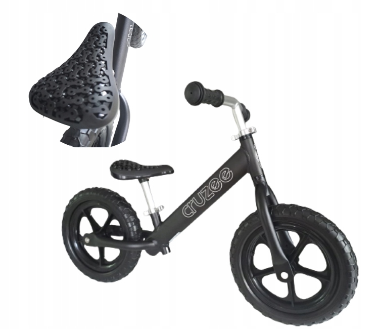 Рама велосипеда зроблена з алюмінію, кермо та підсідельний штир також зроблені з алюмінію, що робить його вагою близько 2 кг. Велосипед для балансування Cruzee має регулювання сідла приблизно від 30-41-50 см (два підсідельних штиря в комплекті), кермо, що регулюється по висоті, без фіксатора кута повороту, легкі та надзвичайно м’які 12-дюймові пінопластові колеса, затиск для сідла та керма з швидким роз’єднанням. для зручного налаштування та складання без використання ключа.