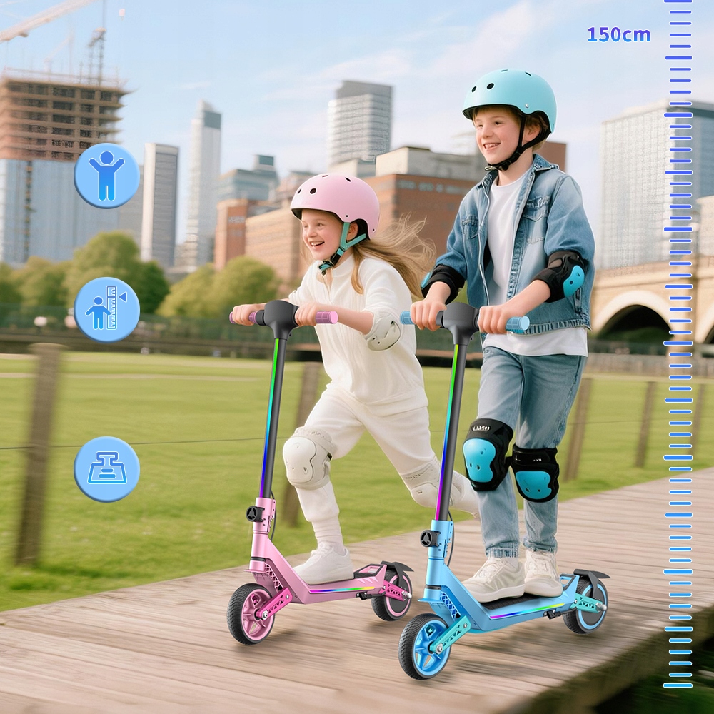 Амортизація та комфорт: дитячий електросамокат має системи підвіски на передніх і задніх колесах, які ефективно поглинають удари та забезпечують плавність їзди - як по асфальтованих доріжках, бруківці, так і по трохи нерівних поверхнях. 6,5-дюймовішини забезпечують додаткову амортизацію, а антиковзаючий протектор гарантує стійкість. Завдяки цьому кожна поїздка на цьому дитячому електросамокаті стає комфортною.