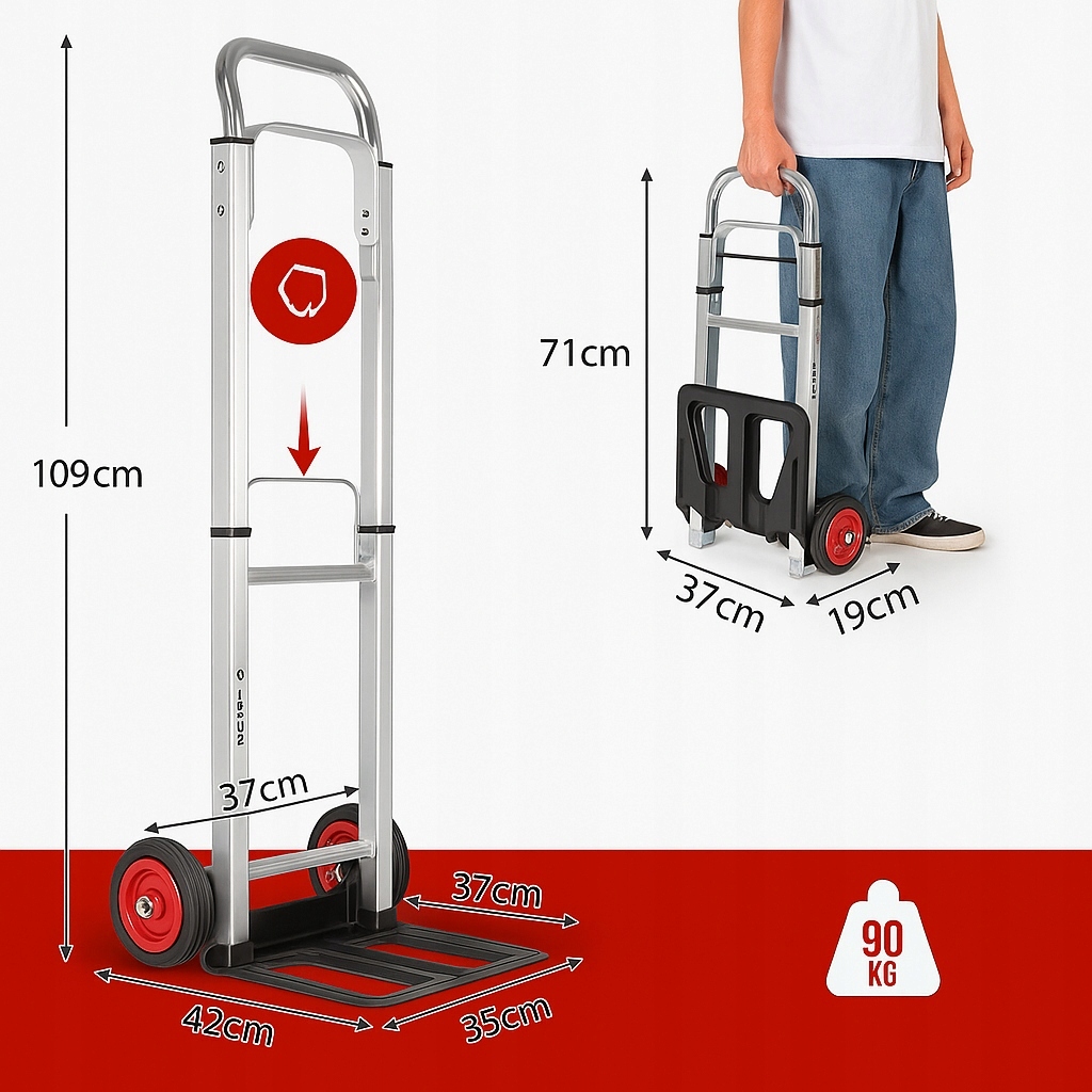 Скласти складський візок ще ніколи не було так легко! Він був розроблений для зберігання в обмеженому просторі та легкого транспортування. Завдяки цьому ви економите місце, яке можете використовувати для інших потреб зберігання. Складна платформа і телескопічна ручка з центральним замком дозволять швидко зменшити обсяг виробу. Ця функція дозволить легко зберігати коляску в невеликому просторі або транспортувати її в багажнику автомобіля.