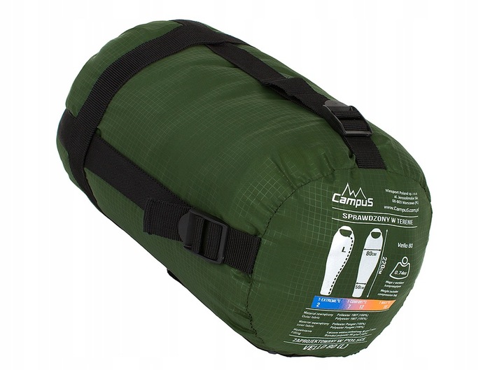 Високоякісний спальний мішок VELLO 80 від Campus. Ця модель є класичним зразком спального мішка мумії. Він характеризується чудовою якістю виготовлення та інноваційним дизайном. Тришарова конструкція забезпечує комфортний сон при температурі від +7 до +12 °C. Завдяки своїм невеликим розмірам і невеликій вазі (0,74 кг) спальник призначений для любителів велосипедних або піших прогулянок (займає мало місця в багажі) і може успішно використовуватися як під час кемпінгу, так і в туристичних походах. Спальник має можливість з'єднання.