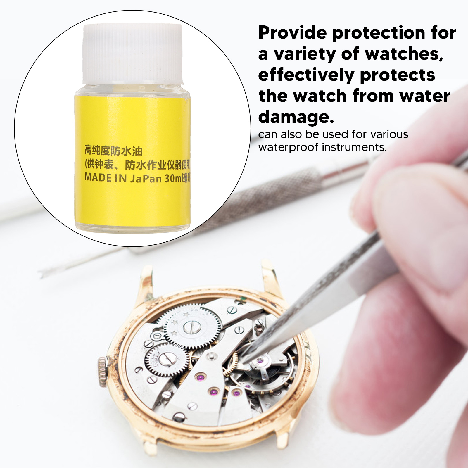 4. Оздоромне обслуговування масла: спеціально розроблений для ремонту та обслуговування годинників, водонепроникна олія для покриття годинника ефективно захищає годинник від пошкодження води.