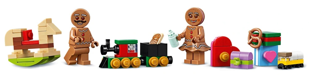 У набір також входить прикрашена ялинка з запакованими подарунками та іграшками, зокрема конячка-гойдалка та потяг. Створення цього вдосконаленого набору LEGO — це веселе та корисне завдання, а готова модель стане чудовою святковою прикрасою для вашого дому чи офісу. Містить пряникові фігурки: тато, мама і дитина.