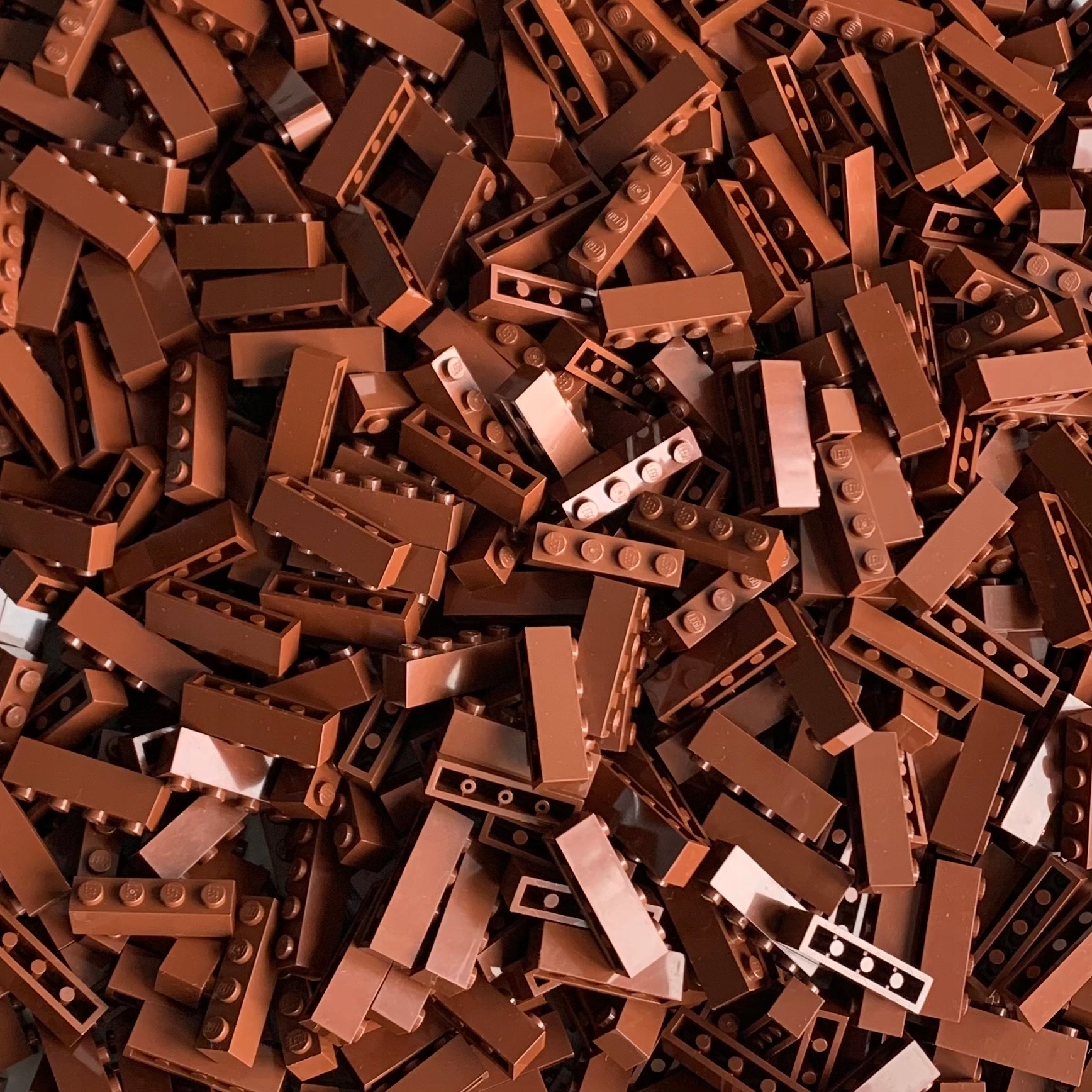 100 штук використовуваних оригінальних блоків Lego 1x4 у червонувато -коричневому кольорі.
