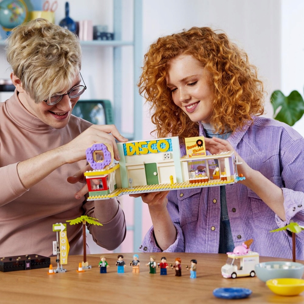 Як у музичному відео Dynamite, ця модель ідеальна для гри та демонстрації на полиця для любителів BTS. Він сповнений реалістичних деталей, як-от записи BTS у магазині звукозаписів, пальми, які можна будувати, і баскетбольне кільце на стіні з графіті. У коробці та в додатку LEGO Builder є інструкції, які проведуть вас через кожен крок складання.
