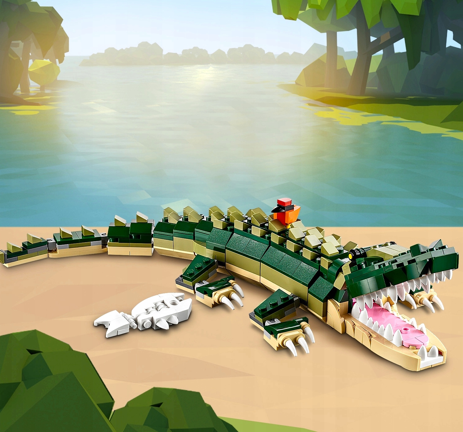 Підіть до річки, щоб провести кілька хвилин із милими тваринами. Просто стережіться голодного крокодила з його великими гострими зубами! Якщо ви відчуваєте себе ще більш авантюрним, перетворіть крокодила на отруйну змію, яка полює на мишу, жабу, яка ловить муху своїм великим язиком, або щось зовсім нове. Вибір за вами з цим фантастичним набором 3 в 1!