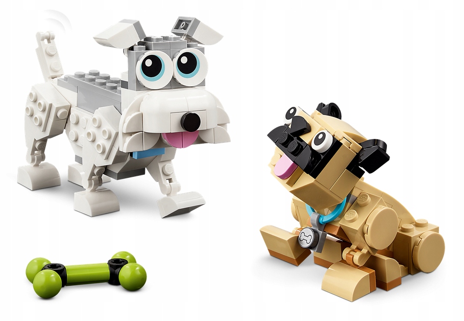 Любителі собак можуть пограти з чарівними собаками з набором LEGO® Creator 3in1 Чарівні собаки (31137). Містить бігля, пуделя та лабрадора з рухомими головами, хвостами та вухами, а також аксесуари, зокрема миску, щітку, іграшкового кролика, м’яча та повідок.