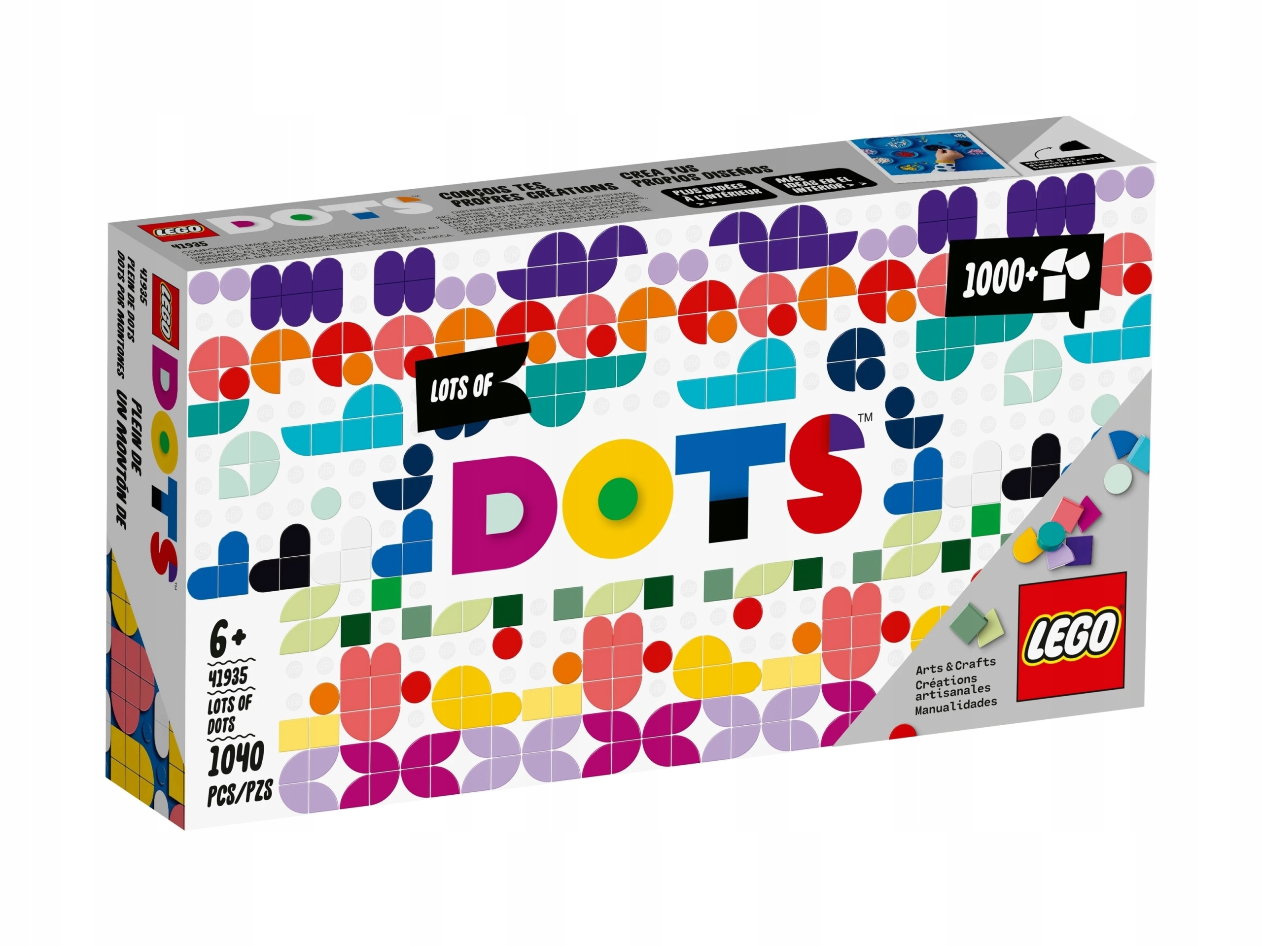 Набір із понад тисячі плиток LEGO® DOTS. DOTS Miscellaneous (41935) — мрія любителів рукоділля. Він містить багато плиток інтригуючих кольорів і форм, таких як кола, півкола та чверті, а також квадратні плитки веселки кольорів. Завдяки цьому асортименту елементів DOTS діти можуть створювати нескінченні творчі роботи.