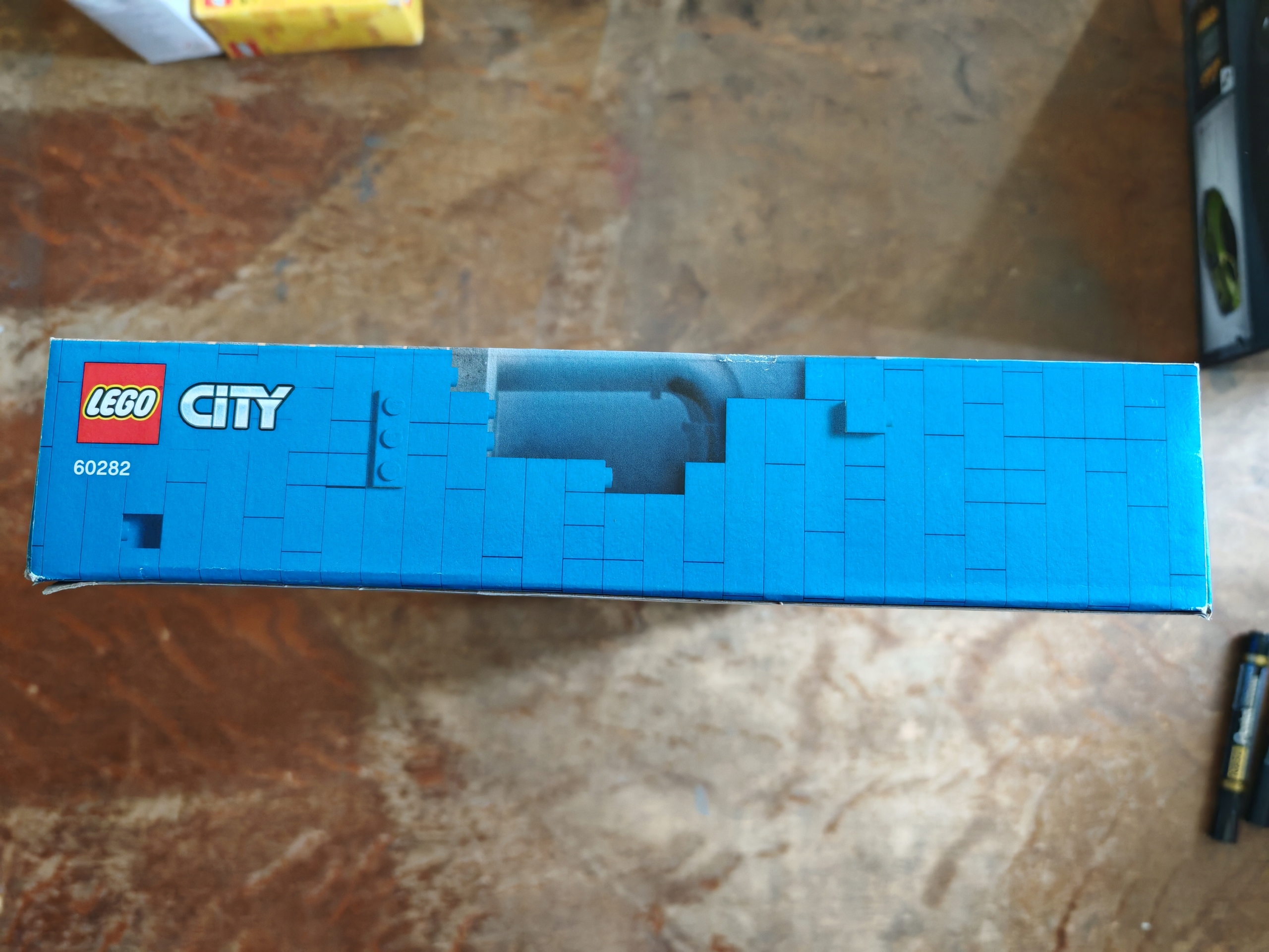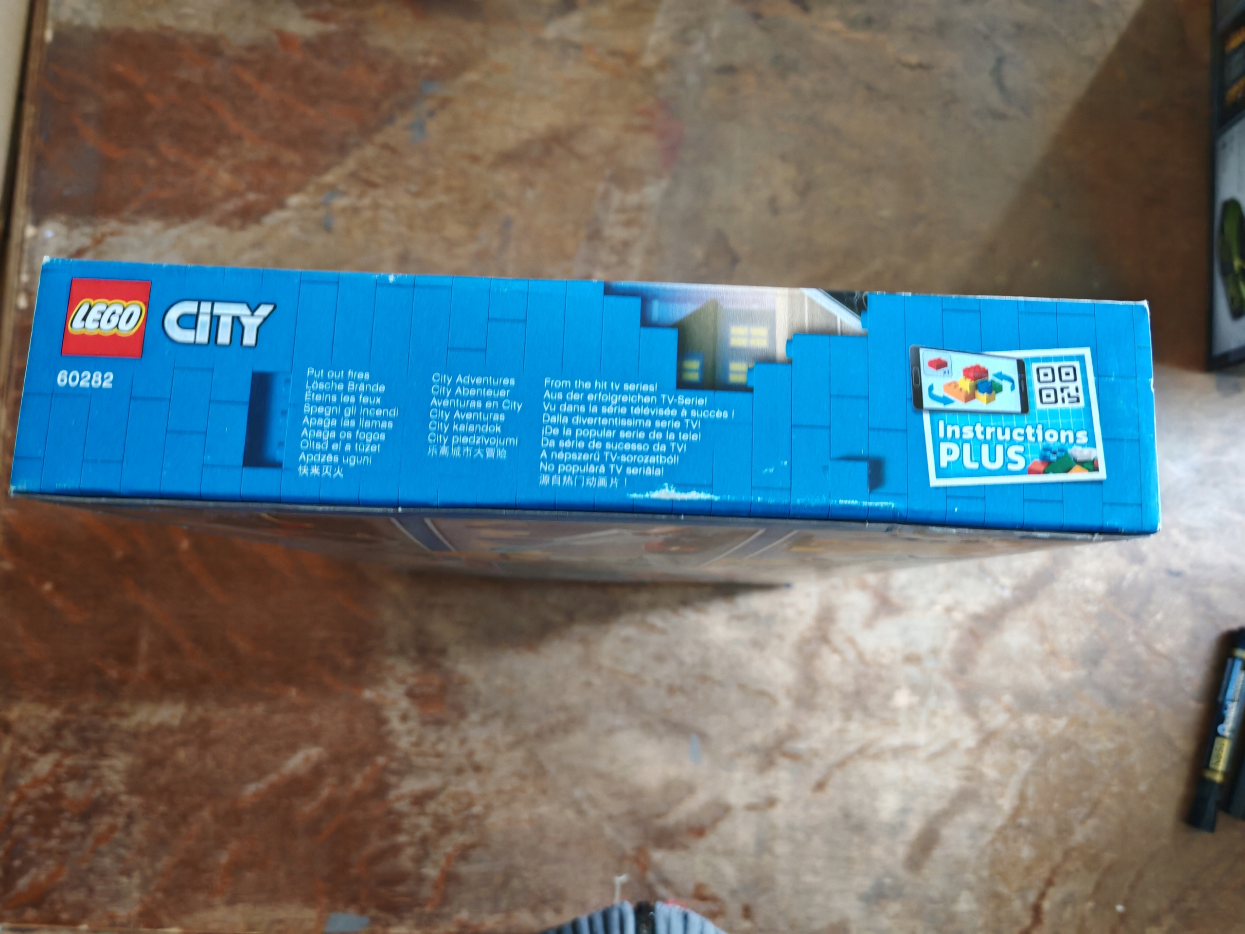 - Що в коробці? Набір чекає класичного пожежного транспортного засобу з бумом, декорації наукової лабораторії з полум'ям, яку можна встановити один на одного, та персонажів із серії Lego City - Bob, Feldman та The Fire Robot.