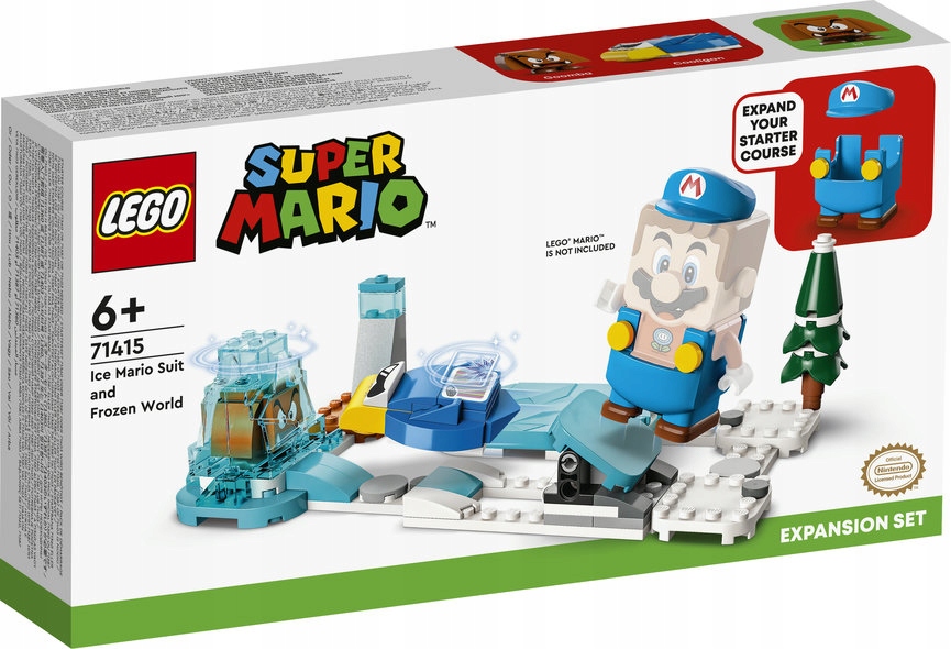 Діти можуть побудувати льодовий рівень LEGO® Super Mario™ за допомогою крижаного костюма Маріо та набору Frozen Expansion (71415). Включає крижаний костюм Маріо для LEGO® Mario™ (фігурка не входить) і фігурки Кулігана та Гумби. Складна крижана плитка імітує звуки катання на ковзанах, коли на ній катається LEGO Mario. Тут також є пускова установка, за допомогою якої ви можете вистрілити з Кулігана в напрямку брили льоду. Після розбивання блоків з'являється Гумба. (Примітка: для гри потрібен стартовий набір 71360, 71387 або 71403.)