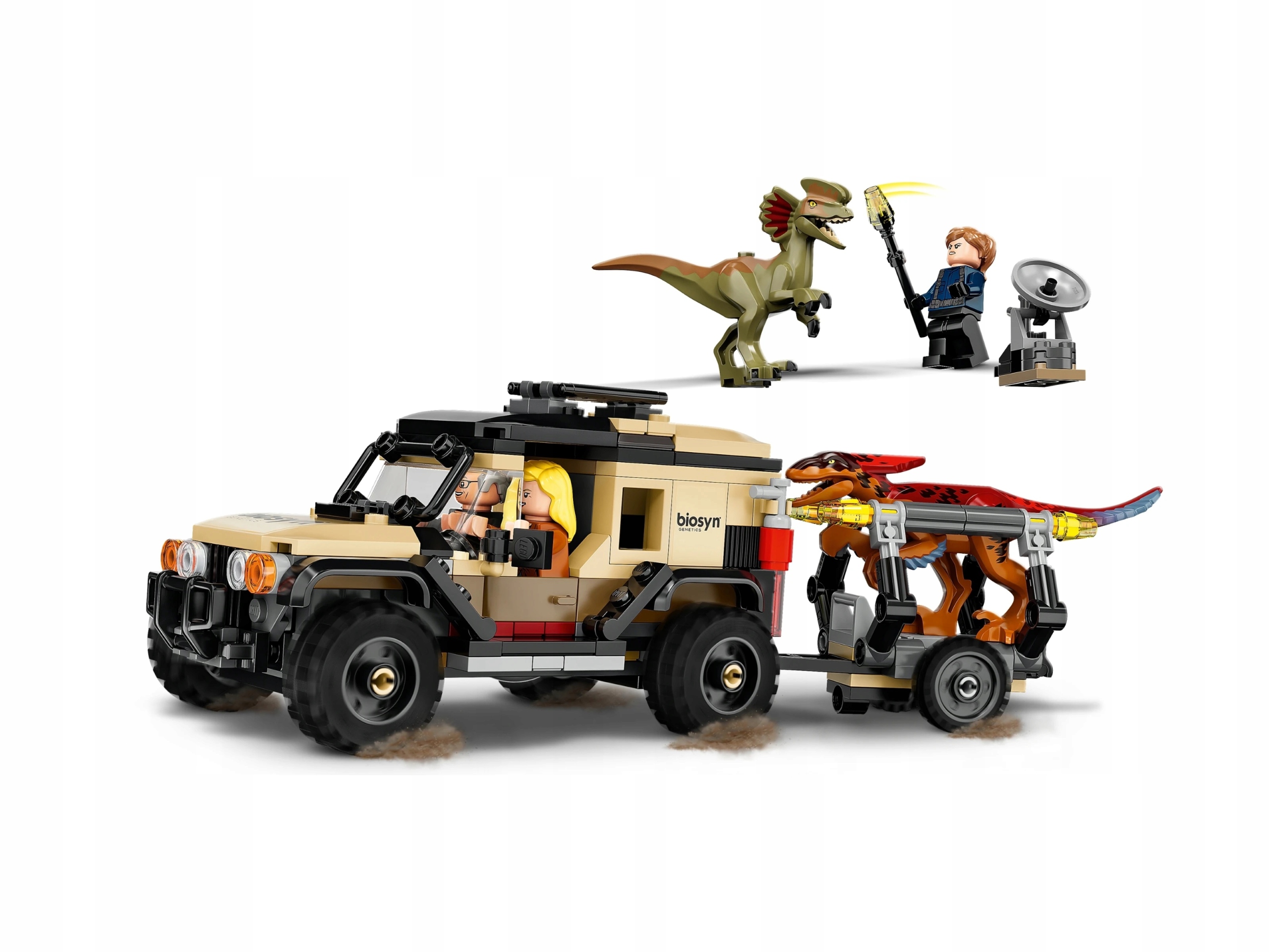 Діти можуть зіграти роль персонажів, відомих з фільму "Джуматський панування" та слідувати динозаврам з автомобілем Off -Road завдяки захоплюючому наборі транспортних пірорапторів та Ділофозавра (76951). Roadster проходить для двох мініфігурів, знімний локатор динозаврів та відокремлений причіп з відкриваючою кліткою, в якій розміщується статуетка динозавра. Набір також включає три мініфігури LEGO®: Ян Малкольм, доктор Еллі Саттлер та охоронці зі зброєю зі спальним центром. Фігури Pyroraptor та Dilophosauro спонукають вас розповідати творчі історії.