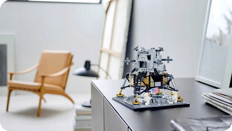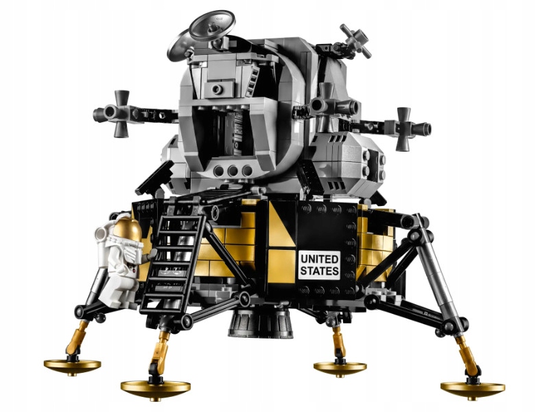 - Модель висотою близько 20 см, шириною 22 см і глибиною 20 см. Включає дві мініфігури космонавтів з прикрасами NASA та золотими шоломами.