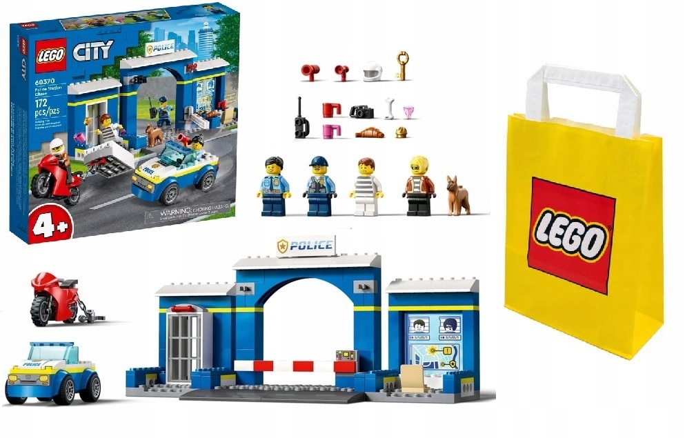 ✅ Коробка містить 172 частини, включаючи іграшкову поліцейську станцію, поліцейську машину та мотоцикл злодія, дві мініфігурки поліцейських, дві мініфігурки бандитів і мініфігурку поліцейського собаки.