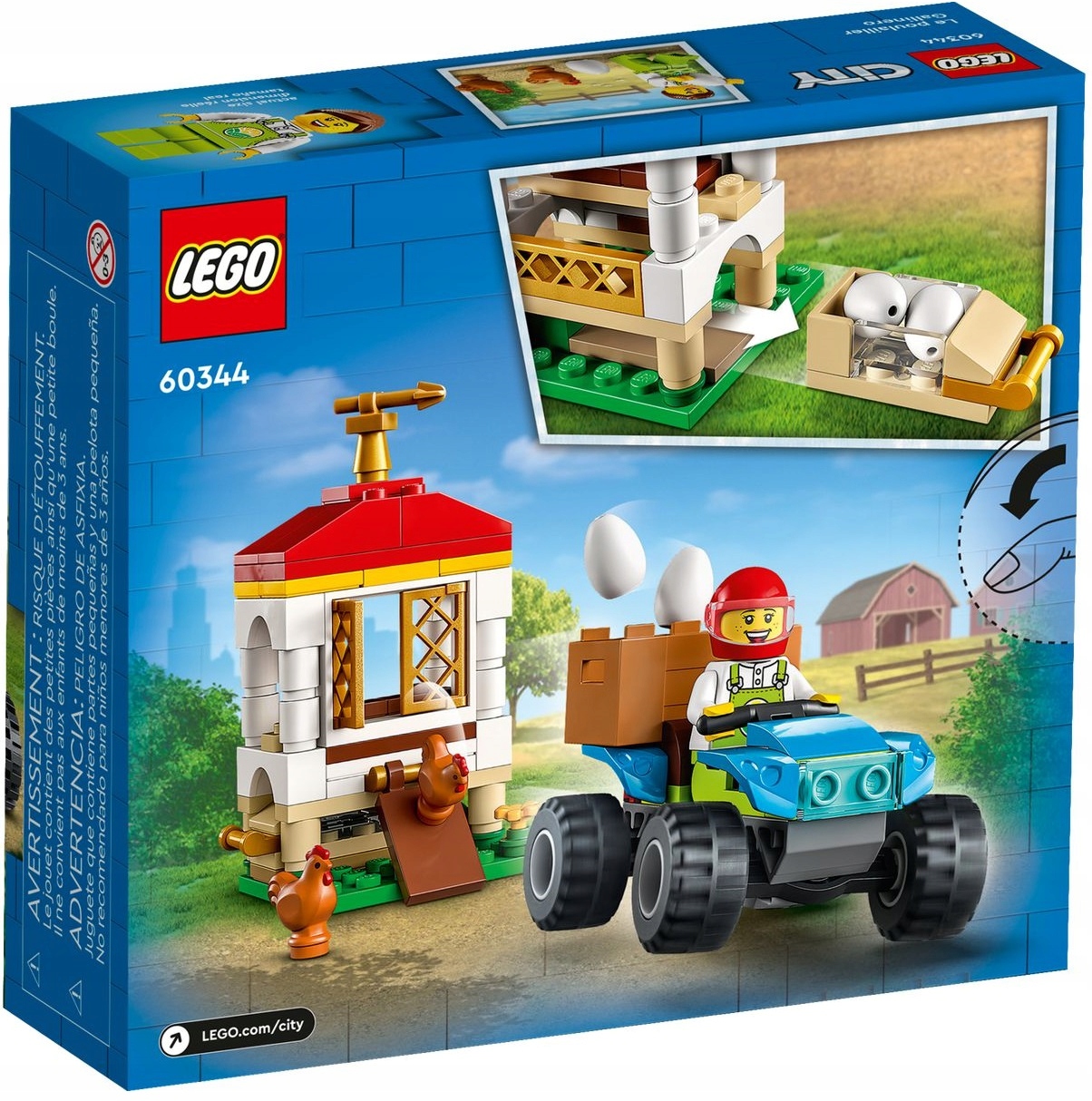 Приєднайтеся до фермера, який веде свій крутий квадроцикл до курника в цьому наборі LEGO® City. Чи знесли кури яйця? Витягніть ящик, щоб перевірити. Покладіть яйця в ящик і потурбуйтеся про курчат, а потім поверніться додому на смачний сніданок.
