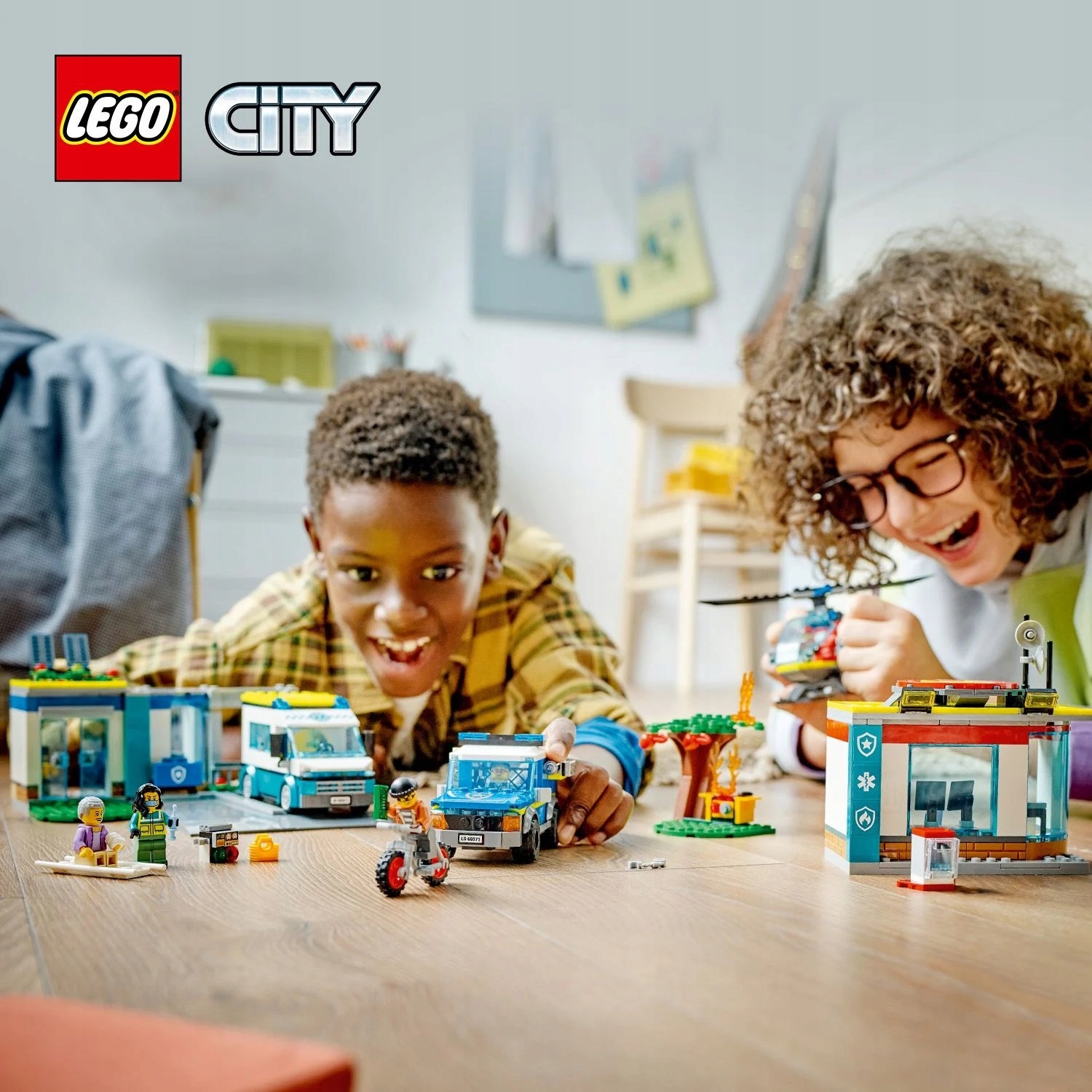 Ця багатофункціональна двоповерхова будівля Парковка для автомобілів екстреної допомоги LEGO® City містить пожежний гелікоптер, позашляховик поліції та швидка допомога, а також п'ять мініфігурок. Крім того, всередині ви знайдете аксесуари для мініфігурок LEGO®, зокрема банкноту, медичне обладнання та два яблука.