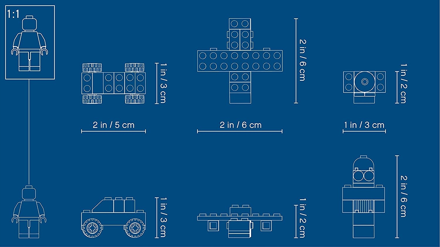 - У набір входить міцна жовта валіза зі зручними відділеннями для сортування та асортимент різнокольорових будівельних блоків, зокрема цеглинки, фігури, колеса та очі.