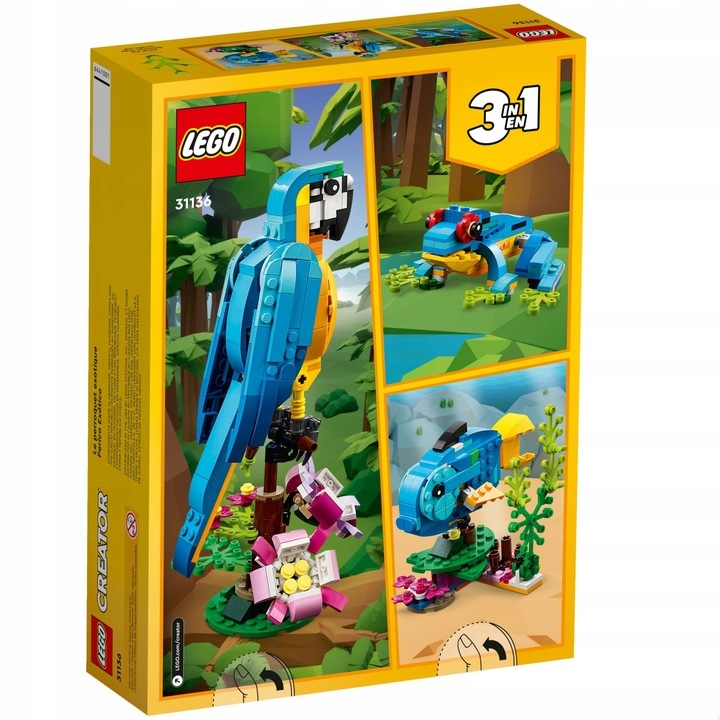 - Екзотика 3 в 1 тваринах - Завдяки творцю LEGO® 3 в 1 набір екзотичного папугу (31136) діти з семи років можуть насолоджуватися тваринами з тропічного лісу - папуга, риба та жаба