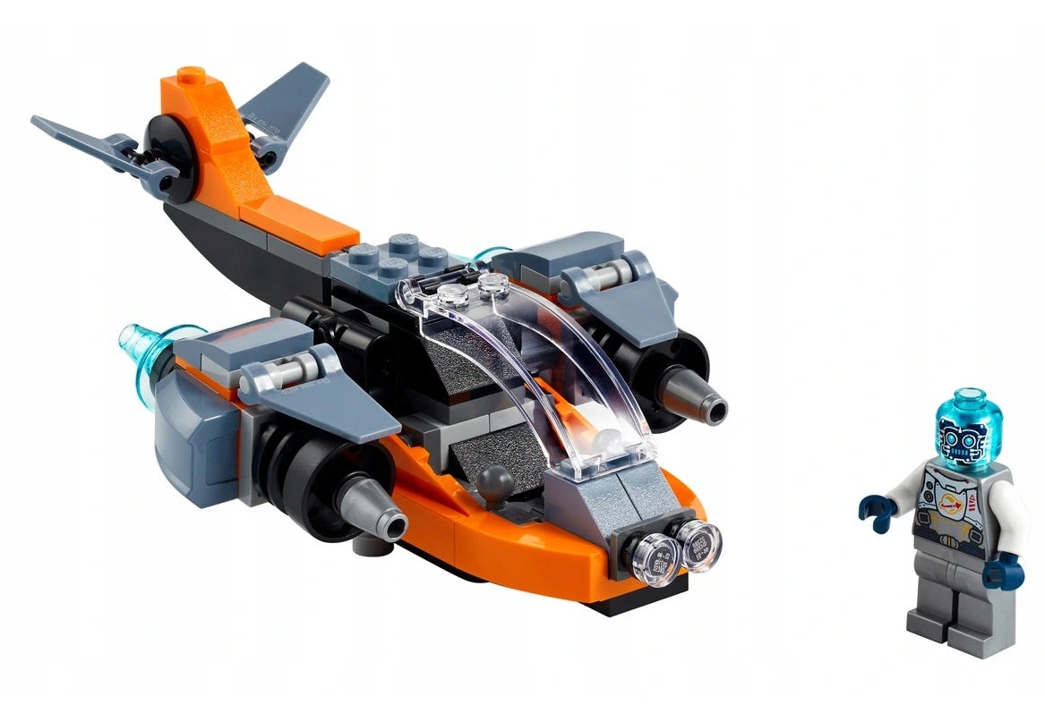 У цьому наборі LEGO Creator 3 дюйми 1 На маленьких дослідників космосу чекають три різні моделі. Вони можуть побудувати кібердрон, а потім перетворити його на кібермеханізм або кіберскутер. У коробку також входить нова для січня 2021 року мініфігурка робота з прозорою синьою головою, яку можна розмістити біля елементів керування кожної машини.