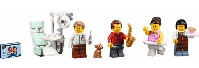 Побачте, як будівля оживає! На першому поверсі ви знайдете пекарню, кафе і кафе, середній — музичний магазин, фотостудія та кабінет стоматолога, а на верхньому — танцювальна студія та квартира з терасою на даху. Відкрийте для себе дивовижні аксесуари, такі як сукня балерини, чихуахуа чи декоративна курка.
