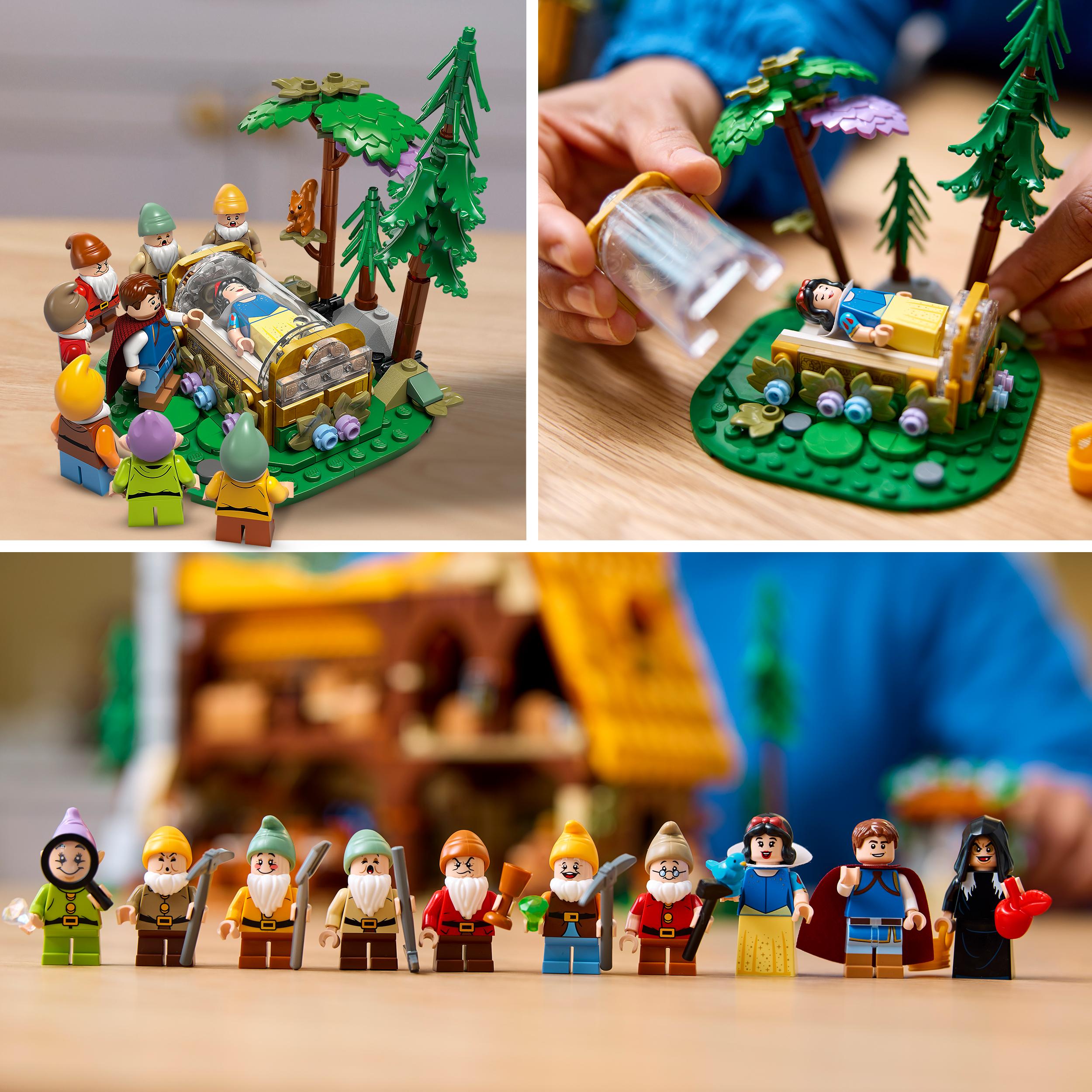 - Культові персонажі фільмів — Білосніжка, Зла Королева в масках, Принц, Вибух, Розумник, Сварливий, Сварливий, Щасливий, Сонний і Апсік, а також як шість фігурок тварин LEGO® ǀ Disney