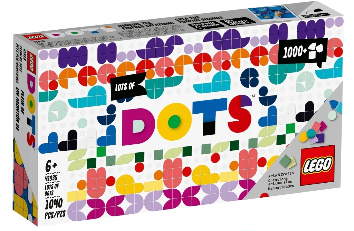 - Набір із понад тисячі плиток LEGO® DOTS Miscellaneous (41935) — мрія кожного ентузіаста рукоділля. Він містить багато плиток інтригуючих кольорів і форм, таких як кола, півкола та чверті, а також квадратні плитки веселки кольорів. Завдяки такому асортименту елементів DOTS діти можуть створювати нескінченну кількість творчих робіт.