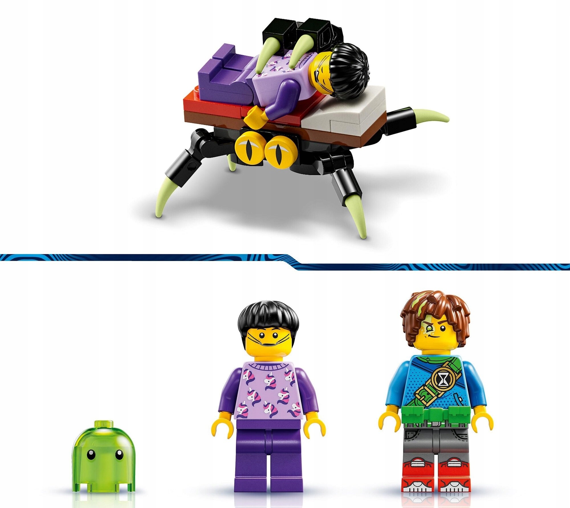 Включає детальні мініфігурки Матео та Джейдена. Серед їхніх аксесуарів — ремінь, тростина-олівець і пісочний годинник, які важливі для їхніх персонажів у серіалі. Діти можуть використовувати аксесуари, що входять у комплект, щоб додати до робота стрілки на руках або реактивний ранець і шолом. Це зробитьзабавуще більше.