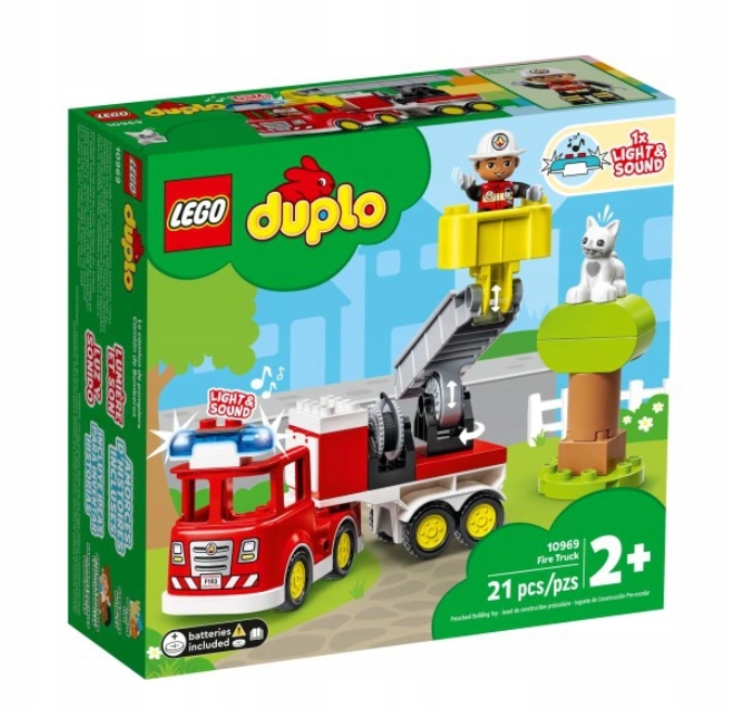 ✅ Реалістичні деталі, набір включає фігурки пожежника та кота LEGO® DUPLO®,а також дерево для збірна та багатофункціональна пожежна машина з проблисковими маячками та гучною сиреною (батарейки в комплекті)