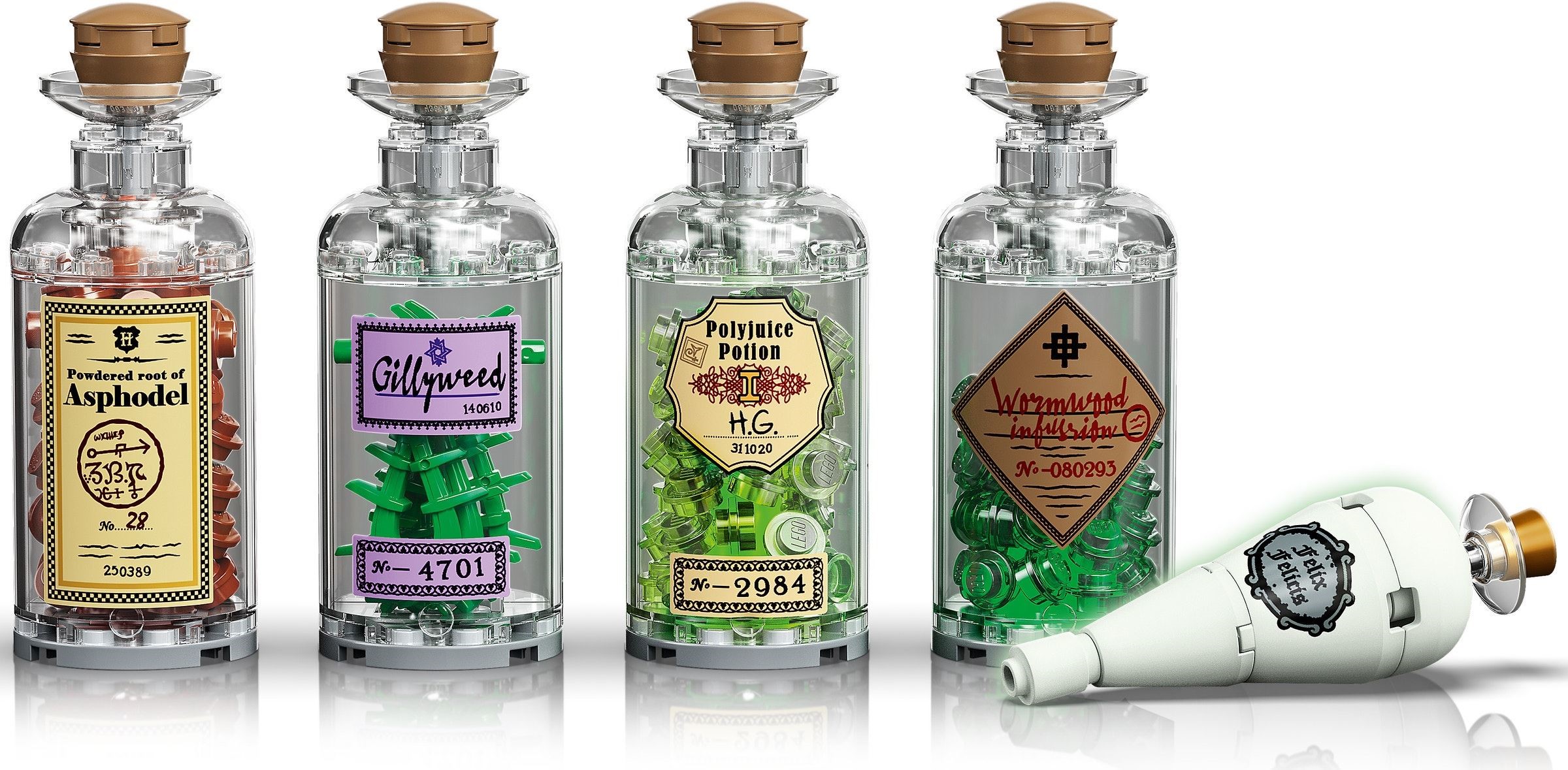 ✅ У набір входить чарівна паличка та окуляри Гаррі, шоколадна жаба Рона, піднос Герміони з п’ятьма пляшками зілля та магічними інгредієнтами(тут є багатосокове зілля, рідке щастя та жаберник),щоденник Тома Редла , Золотий снитч і шкільний шарф(можна змінити, щоб відповідати кольорам кожного з будинків Гоґвортсу).