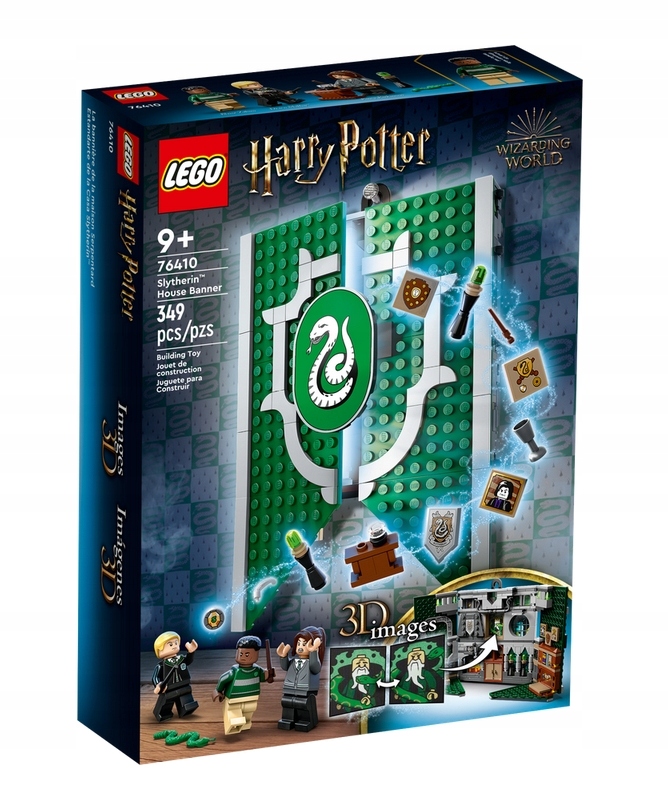 Шани Гаррі Поттера™ можуть продемонструвати свою гордість за те, що вони є частиною дому Слизерин™ за допомогою цього прапорця з кубиків LEGO® (76410). Це ідеальний щоденний подарунок для дітей від дев'яти років. У набір входить тарілка з принтом герба Слизерина і вішалка для підвішування на стіну. Крім того, прапор відкривається, відкриваючи чарівну копію загальної кімнати Слизерина з розкладним диваном, лампами та сходами.