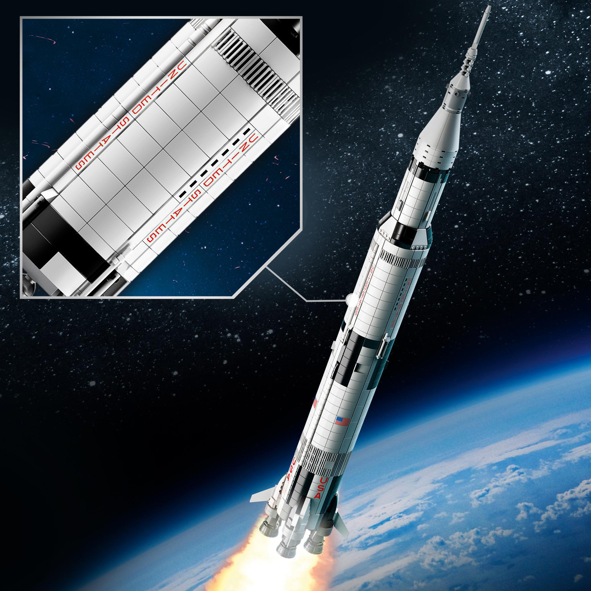 Велична LEGO® модель ракети NASA Apollo Saturn V має три фути заввишки та наповнена автентичними деталями. Ідеально підходить як для демонстрації на полиці, так і для гри. Ракета має три знімні ступені, включаючи третій ступінь S-IVB з посадковим модулем і орбітальний місячний апарат. У набір також входять три підставки, на яких модель можна розташувати горизонтально, три мікрофігурки космонавтів, нові в червні 2017 року для веселої посадки на Місяць, і буклет з інформацією про пілотовані місії «Аполлон» і шанувальників, які створили цей навчальний і надихаючий набір. LEGO Ideas.