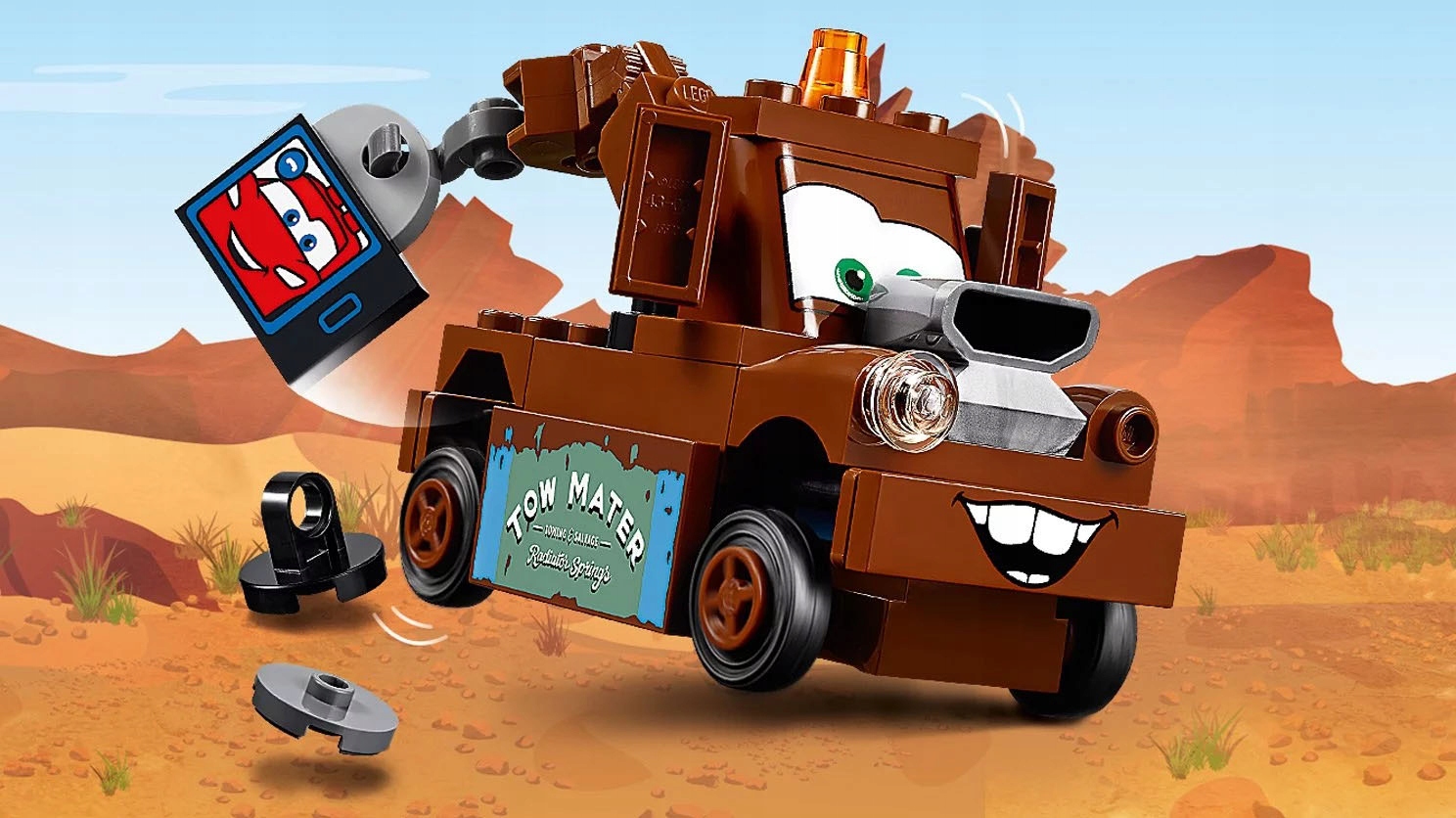 Аксесуари включають різні автомобільні деталі, екран телевізора з малюнком Блискавки МакКвін, знак Мейтера та огорожу.